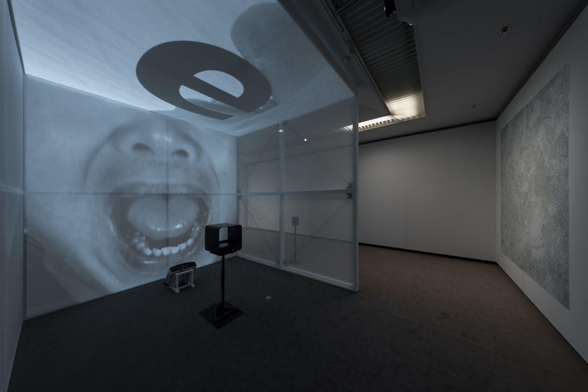 天井から吊るされた3Dプリント、壁面に掲げられた巨大なデジタル・ドローイング、そしてキューブ型のスクリーン内に繰り広げられる映像とホログラムを通じて、足立は文字の潜在的な可能性を探っています。3Dプリントされた文字は、これまで技術的な制約により平面に印刷されてきた文字が、三次元的に展開されていく可能性、言い換えれば、文字が見るものから触るものへと変化していく可能性を示しています。二次元の平面に表されたデジタル・ドローイングでは、「Silence」という言葉が、騒々しいほどに繰り返されています。ここでは従来の文字が、形のうえでは線の集合であること、それが組み合わされることで意味をもった音を指し示すことが改めて意識させられます。キューブ型のスクリーン内にホログラムとして現れる文字は、音響詩の先駆者である、20 世紀前半のロシア・アヴァンギャルドや日本のMAVOの詩を参照したものです。スクリーンには、三次元的に浮かび上がるこれらの詩を解釈した、足立自身のパフォーマンスが映し出されています。