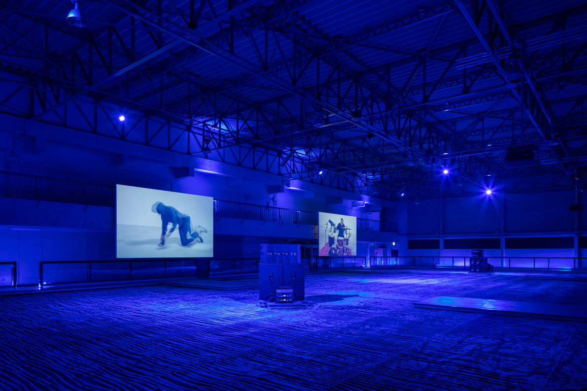 57年にわたって多くの人が滑走したこの空間を、イメージと音が占拠していますが、2つの大型スクリーンとラインアレイスピーカーも、インスタレーション全体の彫刻的要素として極めて重要な役割を果たしています。