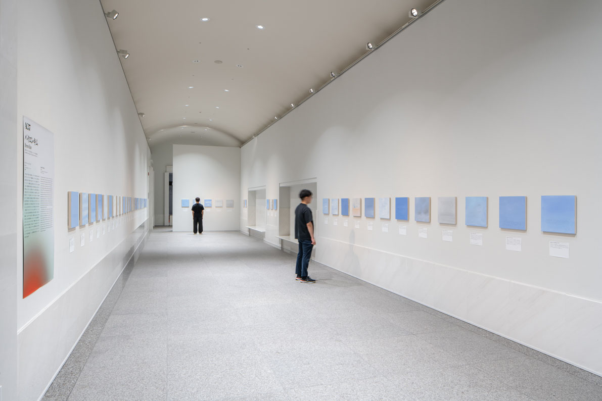 一列に並んで展示された絵画は、バイロン・キムが2001年に始めた連作「サンデー・ペインティング(日曜絵画)」シリーズのうち、2020年2月から2021年2月にかけて描かれた52点です。アマチュアの画家をさす「サンデー・ペインター(日曜画家)」も連想させるタイトルですが、キムは実際にほとんど毎週日曜日の空を描き、その日の気持ちを記した短いテキストを書き込んでいます。ちょうど新型コロナウィルスが世界中に蔓延し、先の見通しが全く立たない未曾有の時間に、キムが家族や友人、自身の制作などパーソナルな対象と、カリフォルニアの山火事、アメリカ大統領選、ワクチン接種など社会的な動向との間で翻弄され、葛藤しながらも誠実に時間を過ごしてきた様子を窺い知ることができます。また、小さな記憶の窓を覗いたような空の絵画は、世界のどこでどのような状況にあっても、私たちが同じ空の下にいることを実感させるものでもあります。