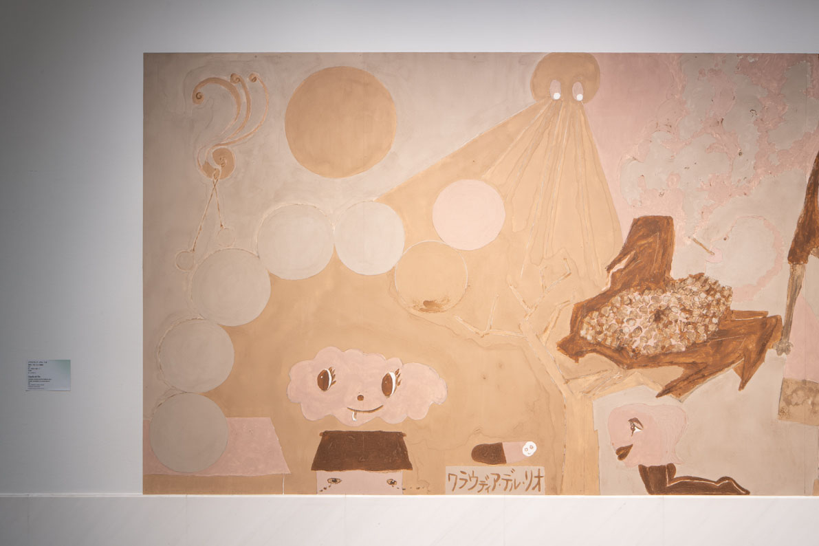 粘土が塗られた長さ24mにも及ぶ巨大な壁面を、さまざまな仮面、クモや魚といった生き物たち、木々や花々などが華やかに彩っています。私たちの日々の暮らしに寄り添い、部屋の隅やベッドの上で心の伱間を埋め、恐怖や孤独を和らげてくれる動物や神々、仮面や演じられた別の人格など、多様なキャラクターたちが、ここでは思い思いに過ごしているかのようです。この壁画には、不思議なほど幸福な時間が流れています。