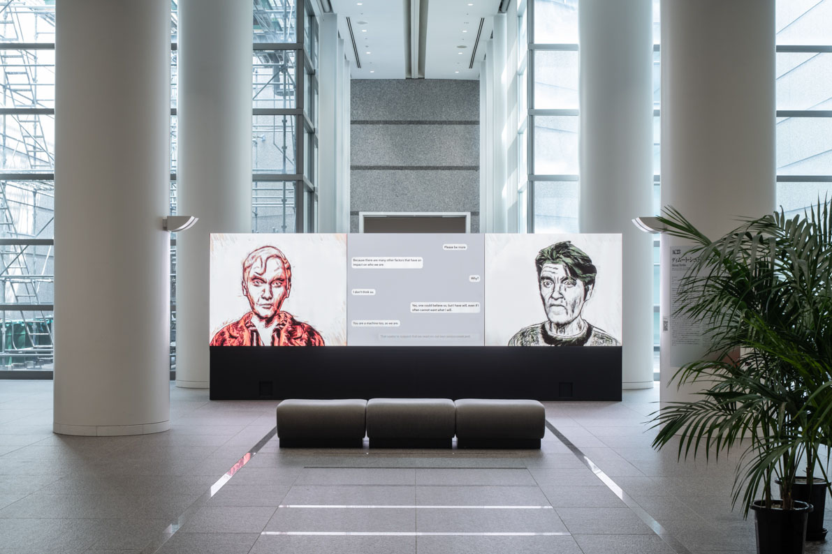 最新作の《エル・トゥルコ》(2022)では、AIと人間の知性の関係を入口に、知識、真実、意味の生成とは何かを問いかけます。画面上では、手描きアニメーション風に描かれた二人のキャラクターが対話します。右側の人物は古代ギリシャ以降の人間の知性と批判的思考を代表するソクラテス。作中では、このシステムの陰で実際の人間が操作しています。左側はAIキャラクターのフォン・ケンペレン。この名前は18世紀のハンガリーの作家・発明家、ヴォルフガング・フォン・ケンペレンに因んだものです。彼は「トルコ人」と呼ばれた自動チェスマシーンで当時の人々を驚かせましたが、実際には内部で人間が操作していました。本作でのソクラテスは、プラトーが記した対話篇『テアイテトス』や心理学の実験などをもとに、フォン・ケンペレンに知識や真実の本質に関する問いを投げかけ、世界、言語、またその両者の関係性などの理解度を確かめます。AIの受け答えは人間の知識や知性を巧みに模倣しているように思えますが、やがて、自然な反応をみせるこの「トーキングマシン」は、高度なマジシャンのトリックのようなものだとわかってきます。