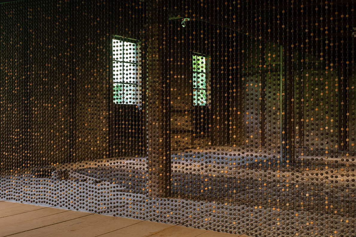 フロレンシア・サディールは、黒い小さなボールが連なった作品《泥の雨》(2021)をこの建物の一角に吊り下げました。大きなカーテンのように空間に広げられたこの作品は、地元常滑の陶芸家である水上勝夫とのコラボレーションによって生み出されたものです。常滑の土を使って彼や地元の若い陶芸家たちがつくり上げた1万2千個以上のボールを、サディールが水上らとともに野焼きをして仕上げました。