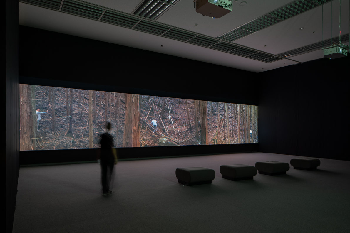 本作は2019年にカポーンが滋賀を訪れた際、信楽の人工林で行った6週間にわたるパフォーマンスを撮影した映像です。アーティストは冬の森に毎日のように裸足で踏み入り、スギやヒノキの一本一本に向けて手をかざし続けました。その儀式的な行為は、木々を労わっているようでもあり、どこか詫びいっているようでもあります。