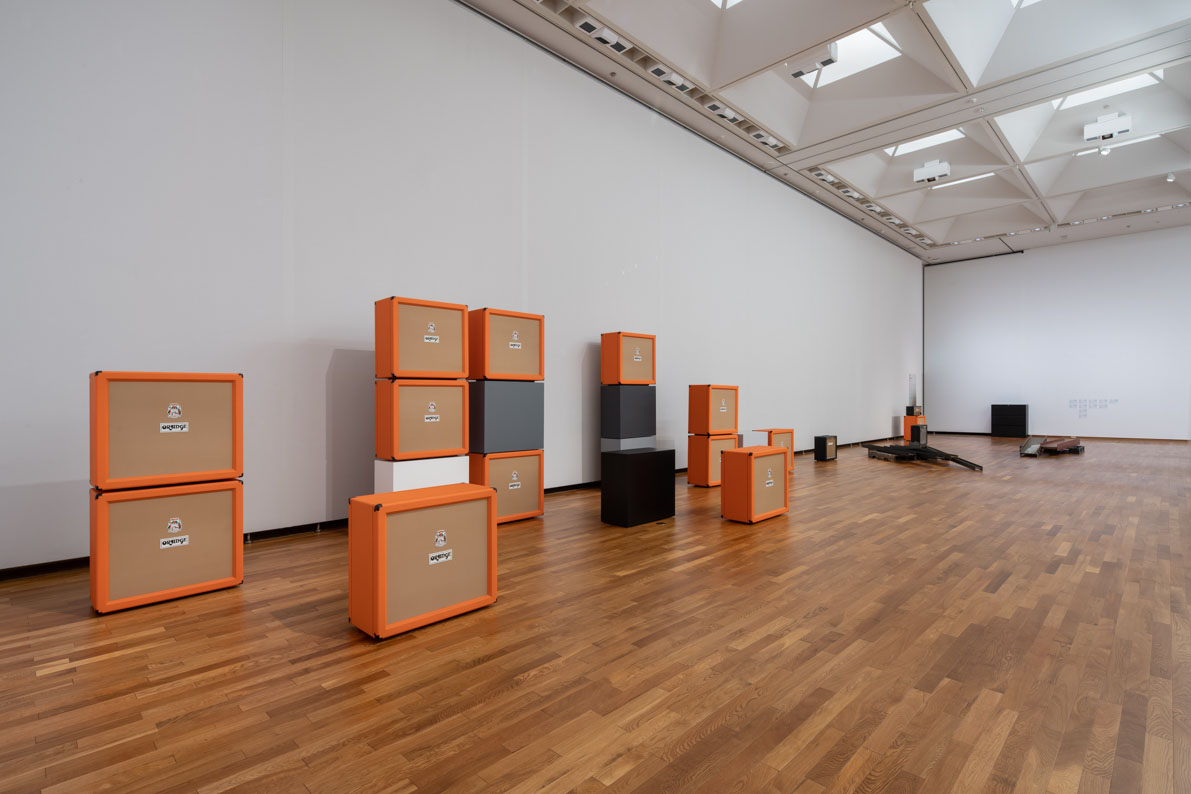 会場の壁沿いに雑然と並べられた使い古されたアンプやキャビネット、そして年季の入ったH鋼は、一見すると何の変哲もない量産品ですが、近付いてよく見てください。これらは全てキャンバスに描かれており、カズ・オオシロによって精巧に作られたトロンプ・ルイユ(だまし絵)だとわかるでしょう。