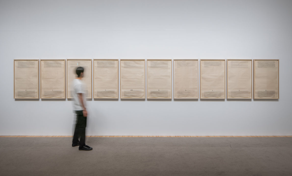 《READ・MADE》(1996)は、長編小説10冊の冒頭部分を画面下部に、文末部分を画面上部に配した紙を10枚並べた作品です。これらは、本の一部を拡大コピーし、一定の幅に合わせて切り貼りして撮影したものを和紙に摺るという方法で制作されました。ここで取り上げられている長大な物語を読んだとき、三輪は、畑の上を飛ぶ飛行機のように、上空から文字を見下ろしているような印象を受けたといいます。様々な本の一節がいったん解体されたのちに、中央に空白、上下にブロック状の塊(グレースペース)というひとつの形式に再構成されることによって、一列に並べられた作品群がまるで上から俯瞰したような統一感のある景観となって我々の前に現れます。
