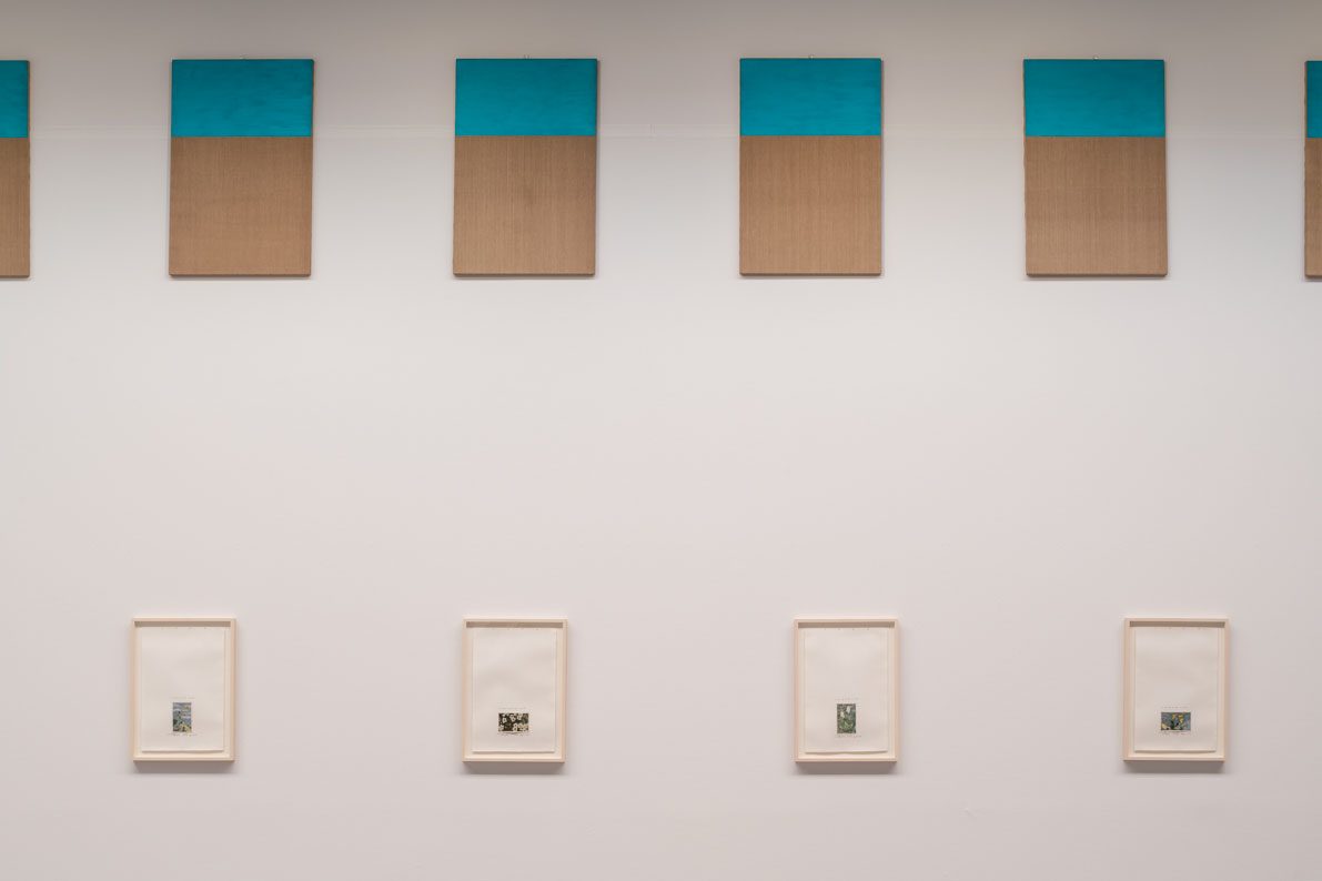 山岳誌に掲載された写真をもとに描かれた油彩画《At the Top of the Mountain》(1990)は、画面の大きさと絵葉書のようなトリミングによって、写真以上の迫真性をもって私たちの前に現れます。同名のコラージュ作品に用いられた山頂を思わせる高山植物の絵葉書は、かつて三輪の祖父が御嶽山で入手したものです。三輪自らが粘土をこねて造り上げた立体物を描いた《STATUE(彫像)》(2009–2010)も、油彩画でありながらまるで彫刻のように平面を突き抜けてくるような感覚を見る者に与え、描き出された立体物は人物像にみられるようなある種の生命感と存在感を放っています。今回初めて公開される《LE BLEU DU CIEL》(1987年頃)は、フランスの哲学者ジョルジュ・バタイユの『青空』に着想を得て制作されました。水平方向の筆致を残した青一色で画面上部のみが塗られ、横一列に並べられた20枚の作品は、上空を思わせる高い場所に展示されてひとつの物語を紡いでいるかのようです。