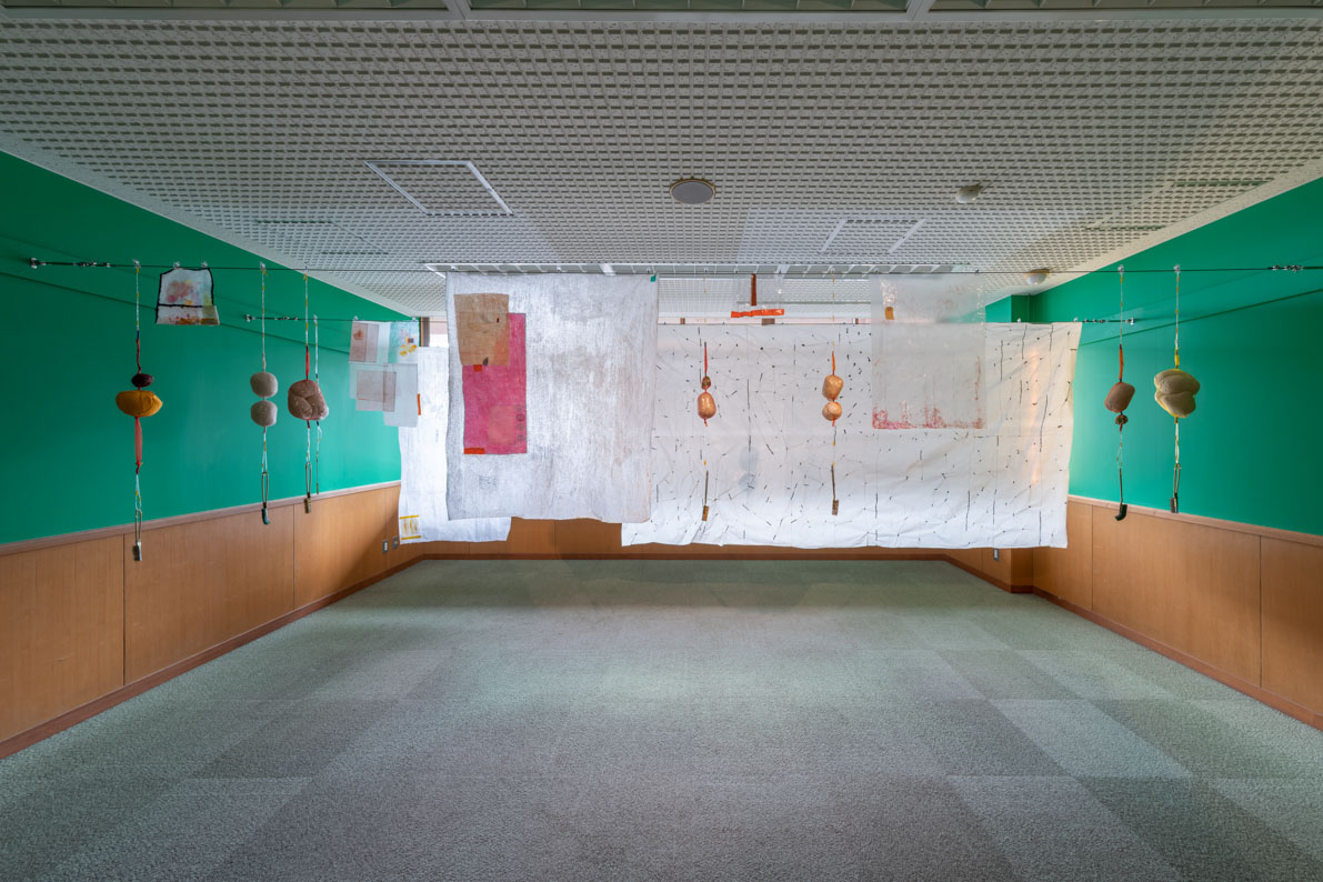 一列に連なる三つの部屋は、かつて一宮市立中央看護専門学校の応接室、会議室、そして校長室でした。そこではどのような話が交わされていたのでしょうか? 南アフリカ拠点のアーティスト・文筆家であるニャカロ・マレケは、インスタレーション、ドローイング、版画、パフォーマンス、文学など多様なメディアで表現をしてきました。なかでも薄い紙やプラスチックに刺繍、パステル、木炭などで抽象的な図柄を描いた絵巻のようなドローイングは、詩や言葉を紡いだ美しく繊細な物語のようです。