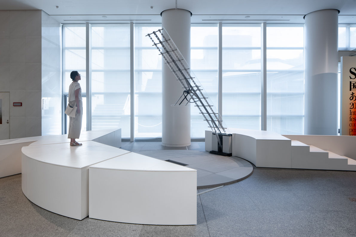 白い大理石が印象的な愛知県美術館のロビーには、モニュメンタルな《可動橋/BH 5.0》が設置されました。空間に呼応した白と無色透明とシルバーを基調色とし、高さ約0.7mのステージと長さ4mの橋桁から成るこのミニマルで無機質な跳ね橋からは、一時間あたり6回、橋桁が降りてきます。偶然その機会に居合わせ、高さに躊躇せず足を踏み出そうと心を決めた人だけが、橋を渡ることができます。その人は自ずと観客からパフォーマーへと変容します。