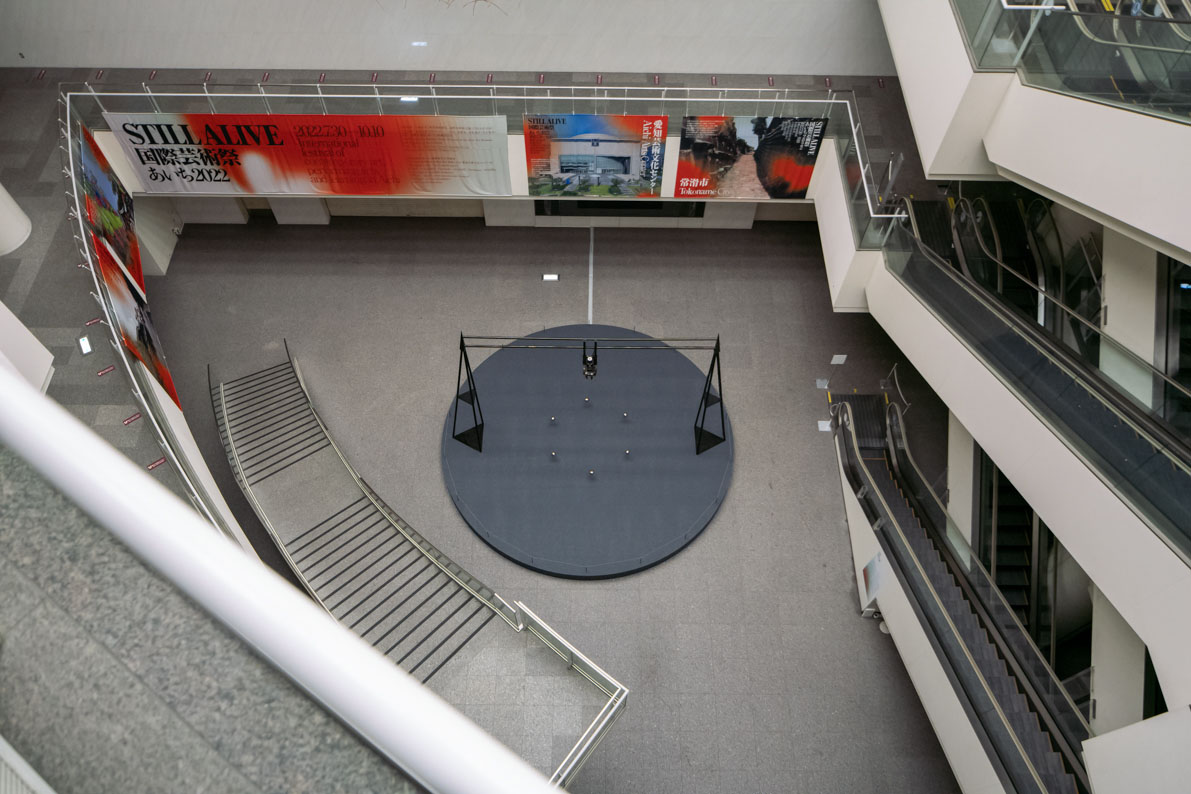 フレームから吊り下げられた6つの振り子が、それぞれに動き続けています。ぶつかることなく見事に制御されているように見えて時折接触する、この一連の振り子の動きを追いながら、見る者は目が離せなくなります。小野澤峻は、物理の実験のようなこの作品《演ずる造形》(2021)をパフォーマンスとして捉えています。小野澤は中学時代にジャグリングに出会い、自らジャグリング・パフォーマーとしても活動してきました。古代エジプト時代にすでに存在していたとされるジャグリングは、修練によって人間の身体能力を拡張するという意味では、時代や地域を越えた普遍性をそなえていると考えられるでしょう。それを機械、あるいは動く彫刻に転じた《演ずる造形》は、コロナ禍によって世界の先行きが不透明になった時期に制作されました。それぞれの銀色の玉が衝突しないように制御されている状態から、それが一旦崩れ、再びもとの通りに美しい動作を再開する動きは、まさしく人間社会の秩序とその崩壊、そして回復のメタファーと捉えることもできます。ウィルスの世界的蔓延や戦争によって日常が一瞬にして奪われ、世界中の多くの人々が大切な命を失いました。そのなかで再び、日々の暮らしが戻ろうとしている今日。この《演ずる造形》を見つめながら、人間のレジリエンス(回復する力)に希望を託すこともできるかもしれません。