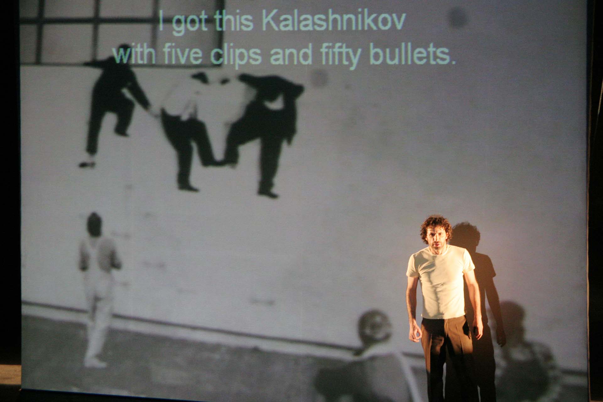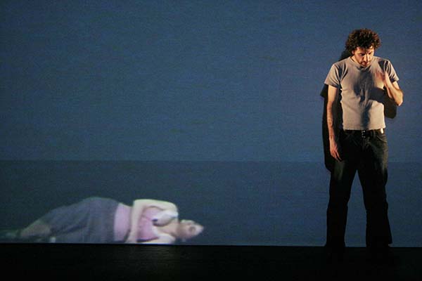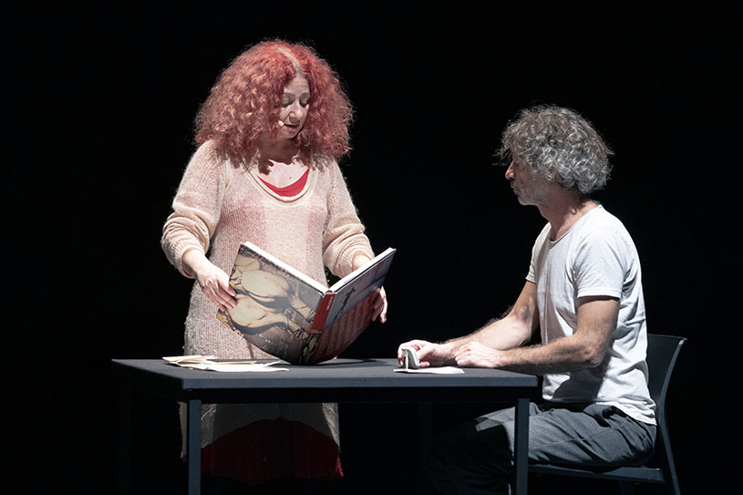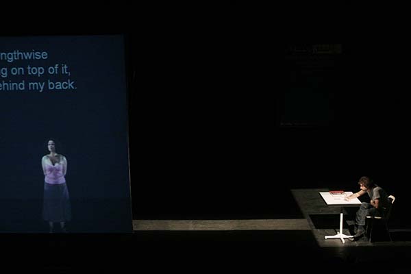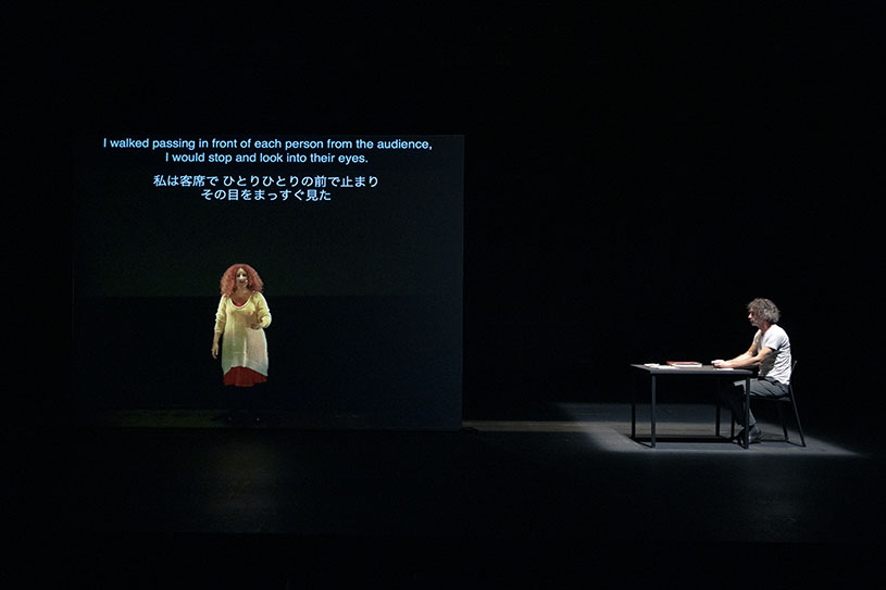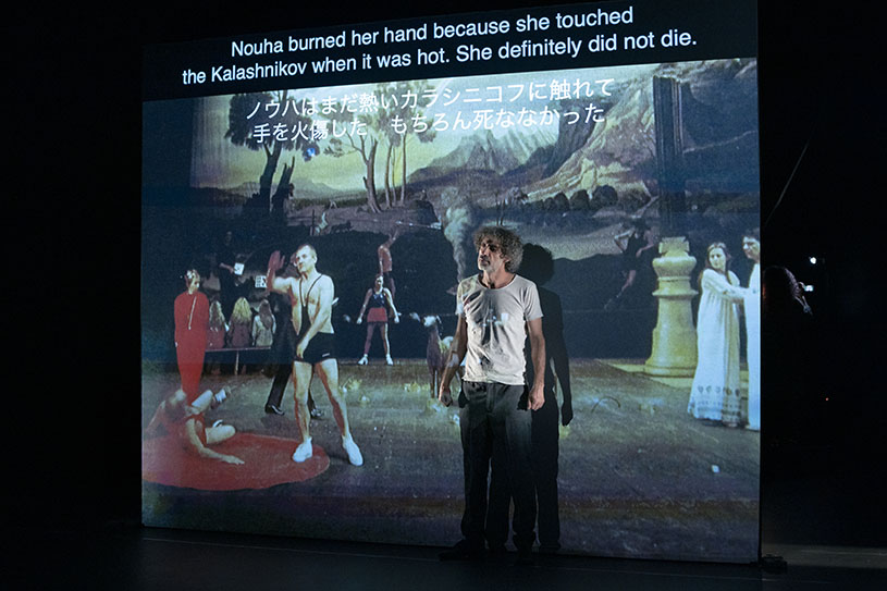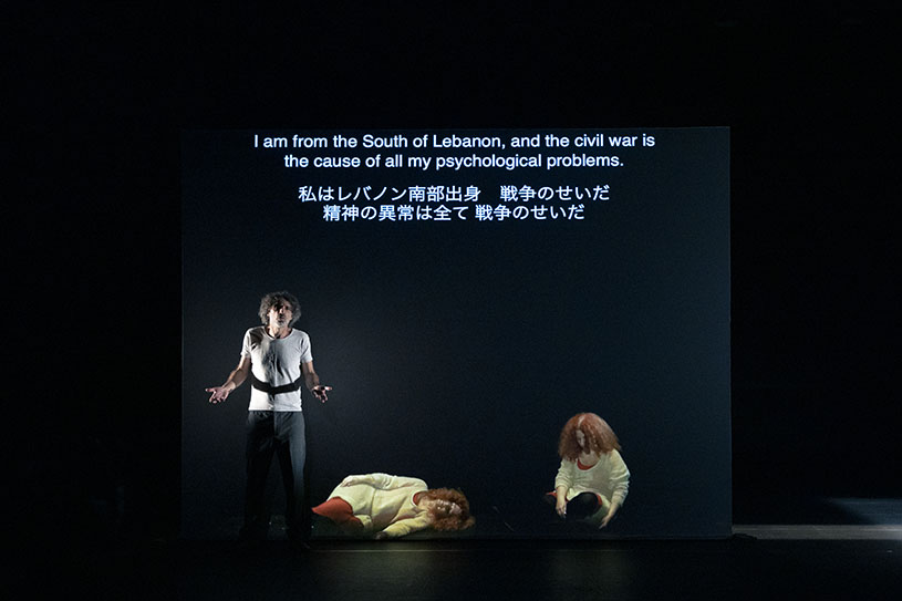 ムルエは今回、「あいち2022」のテーマに応答し、パフォーマンス・アート史を題材にした代表作『表象なんかこわくない(Who’s Afraid of Representation?)』(2005年、ベイルート初演)を17年の時を経てアップデート上演する。シンプルな舞台上では、パフォーマンス・アート史の文献を開くパフォーマーが、そのページを綴った伝説的パフォーマンス・アーティスト、例えばヴァリー・エクスポート、マリーナ・アブラモヴィッチ、クリス・バーデンらになり代わって語り始める。だが、ボディ・アート史に残る自傷的アクションを語るはずの言葉は、1975年から15年間続いたレバノン内戦に絡め取られていき、どこまでがアーティスト本人の手によるテキストか、判然としない。そこにムルエは、2002年に実際にベイルートで起こった大量殺人事件の犯人の語りを併置していく。史実では交わることのなかったパフォーマンス・アート史とレバノン現代史が、皮肉にも暴力を媒介にフィクショナルに交差する「歴史の再演/リエナクトメント」を前に、私たちは震撼せずにはいられない。