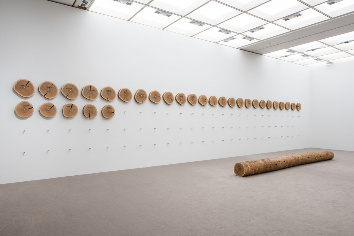 今回の出展作《イベント・ホライズン》(2016)は、1本のオークの木の幹を100枚に切断し、その年輪に応じた1917年から2016年までの歴史的な出来事を刻印した作品です。展示期間中、床面に設置されていた 各ピースは毎日1枚ずつ、壁に打ち付けられた金具に掛けられていきま す。会期最終日の10月10日には、すべての木製ディスクが壁面に移動します。このように本作は、人類の歴史とオークの木が歩んできた歴史を結びつけ、1本の木の断面から、現代世界の自然の営みや宇宙法則といった大局的な視点を想像させる作品だといえるでしょう。