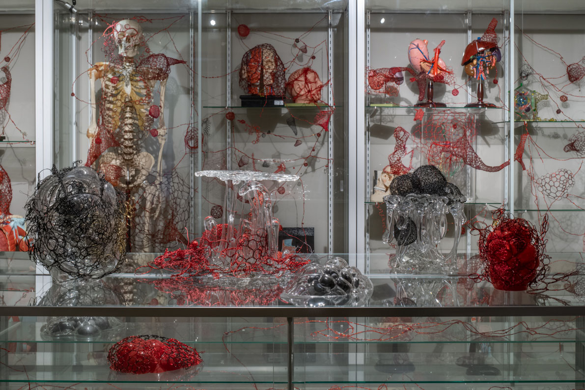 異常化した細胞の固まりでもある癌が、自らの身体、ひいては生命を崩壊させようとするのに対し、人間の精神をつかさどる魂がどこにあるのか。この問いは、われわれがどこから来て、どこに行くのか、生と死の境界はどこにあるのかといった、塩田の初期から一貫する根源的な問いに連なるものでもあります。毛細血管のように糸や針金が絡み合うガラスは、内部にある細胞を包む膜とも、細胞に付随する不可視の魂を宿らせる器とも捉えることができるでしょう。