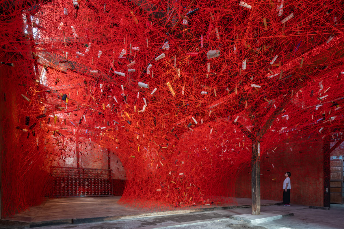 赤や黒の毛糸を使った塩田のインスタレーションは、いまや国際的にも彼女の最も良く知られたシリーズのひとつです。赤は人と人をつなぐ運命の糸、血縁、あるいは体内の毛細血管などを連想させます。われわれはどこから来て、どこに行くのか、生と死の境界はどこにあるのかといった、根源的な問いに初期から取り組み、そこには見えない「不在のなかの存在」を表現してきた塩田。本芸術祭では、のこぎり二に残る毛織物の機械や糸巻きの芯などを、一宮市の毛糸を使ったインスタレーションに融合させ、この場所に生きた様々な命、労働、エネルギーの記憶を蘇らせています。