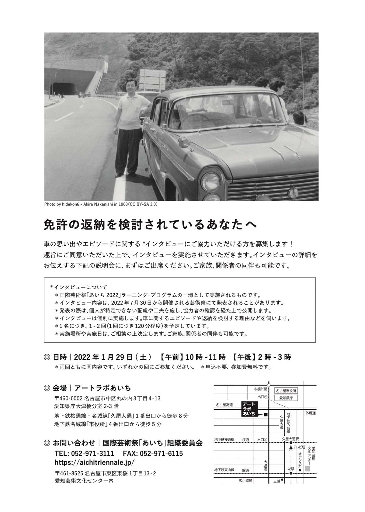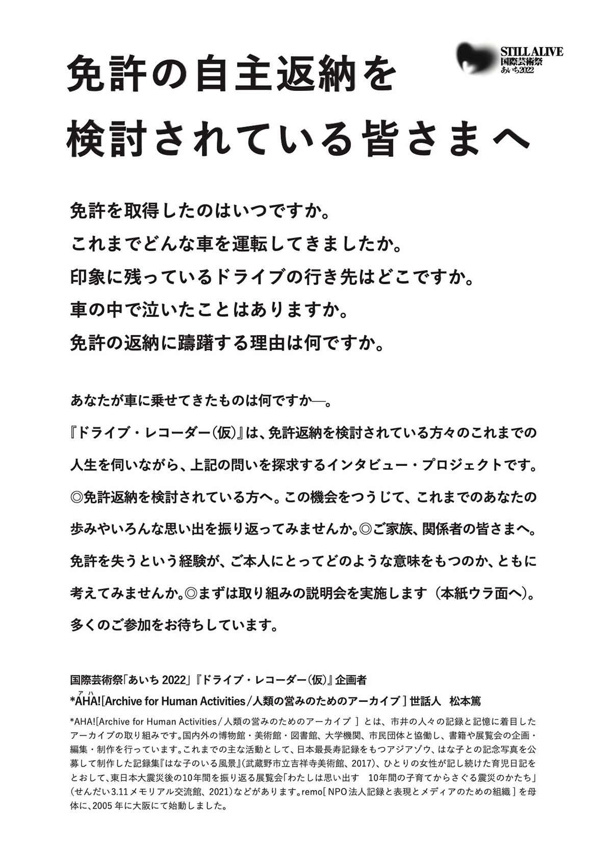 そんなAHA!が「あいち2022」のラーニングプログラムで行ったのが、《ドライブ・レコーダー》というリサーチプロジェクトです。これは、愛知県の主要産業である自動車、なかでも近年注目を集める自動車免許の自主返納に注目したプロジェクトです。