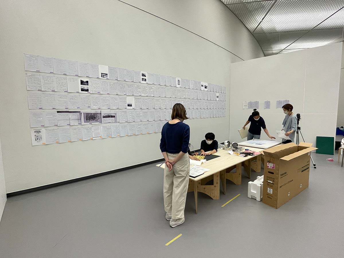 そこで僕らがとった方法は、リサーチした走行記録そのものをアーカイブ的に展示すること。つまり、メンバーがリサーチ中に見ていたものと、展示会場で観客が目にするものをできる限り「同じもの」にすることでした。こうすることで、観客は、僕らの「Tさんの走行記録をなぞる」という経験を、資料そのものや、そこに残されたメンバーのリサーチの痕跡をインターフェイスとして、展示会場で追体験することになると考えたのです。
