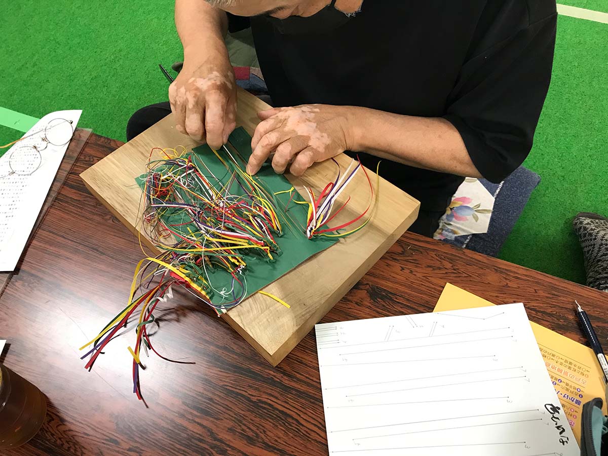 明治に入り、神仏混淆の花祭が禁止されるなか、一部の集落では祭祀で使われる道具や飾りの色を陰陽道の五色から白一色に変える(=神道にする)ことで祭りが存続された。色にも様々な情報や物語が含まれているのだと再認識。祭祀の際に神様の依代(よりしろ)となる「切り草」も、集落によって色や形などに違いがある。小刀で重ねた紙に切り目を入れ、折り、しごいて作っていくが、平面の紙に切れ込みを入れて展開していくだけで、これだけのバリエーションを生み出し、神々に捧げてきた人間の信仰心とモノに込める想いに感心する。
