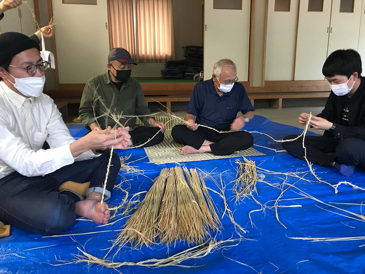 鬼祭りの飾り結びについて、神主さん(平石雅康氏)と氏子町会のみなさんより話を聞く。