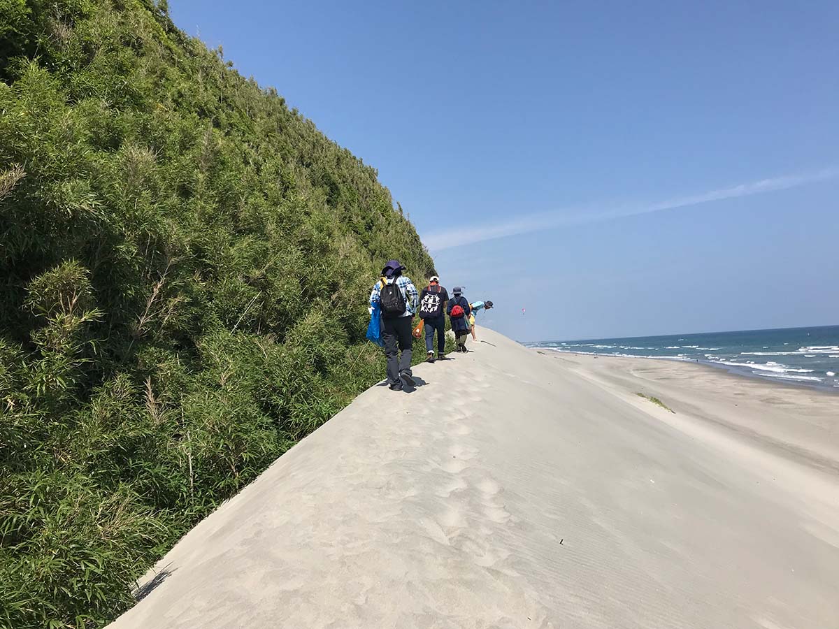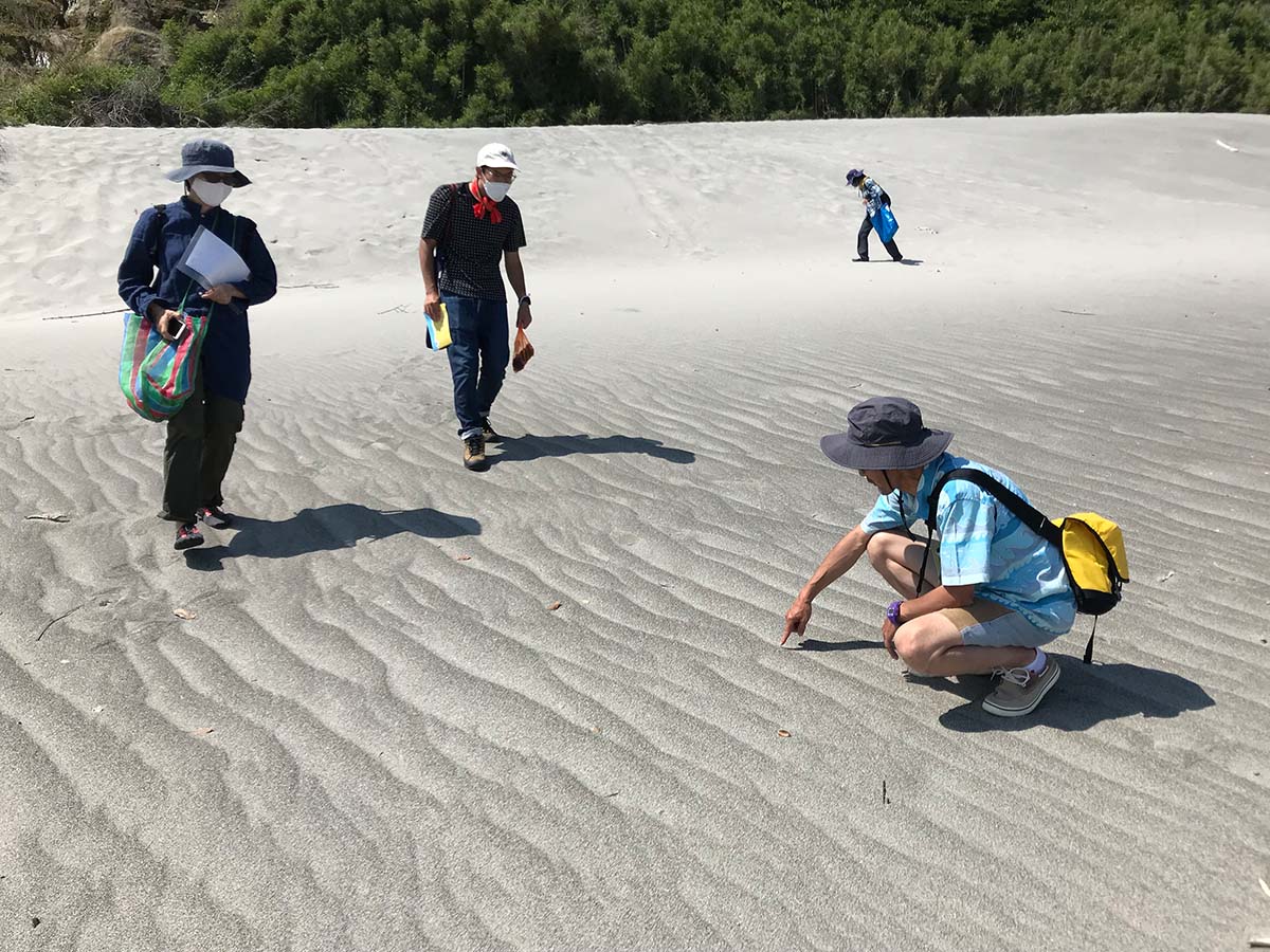 伊古部西海岸(砂丘)→赤羽根海岸→西ノ浜を巡って観察し、漂着物や石、流木などを収集する。