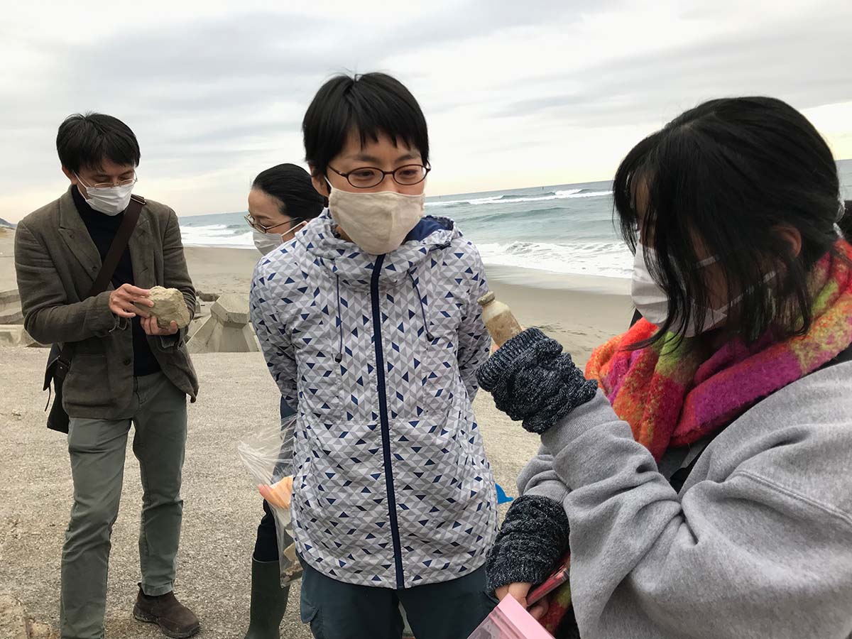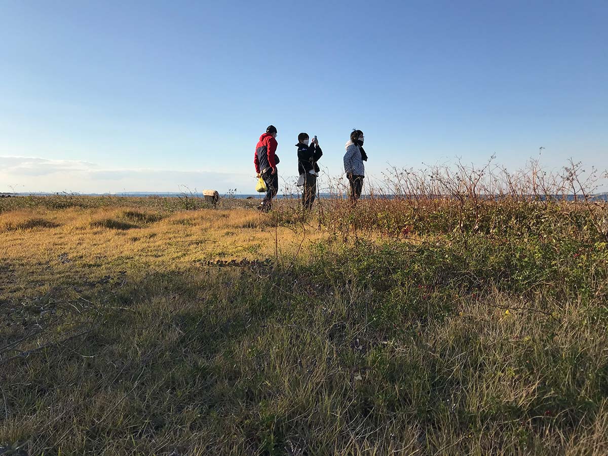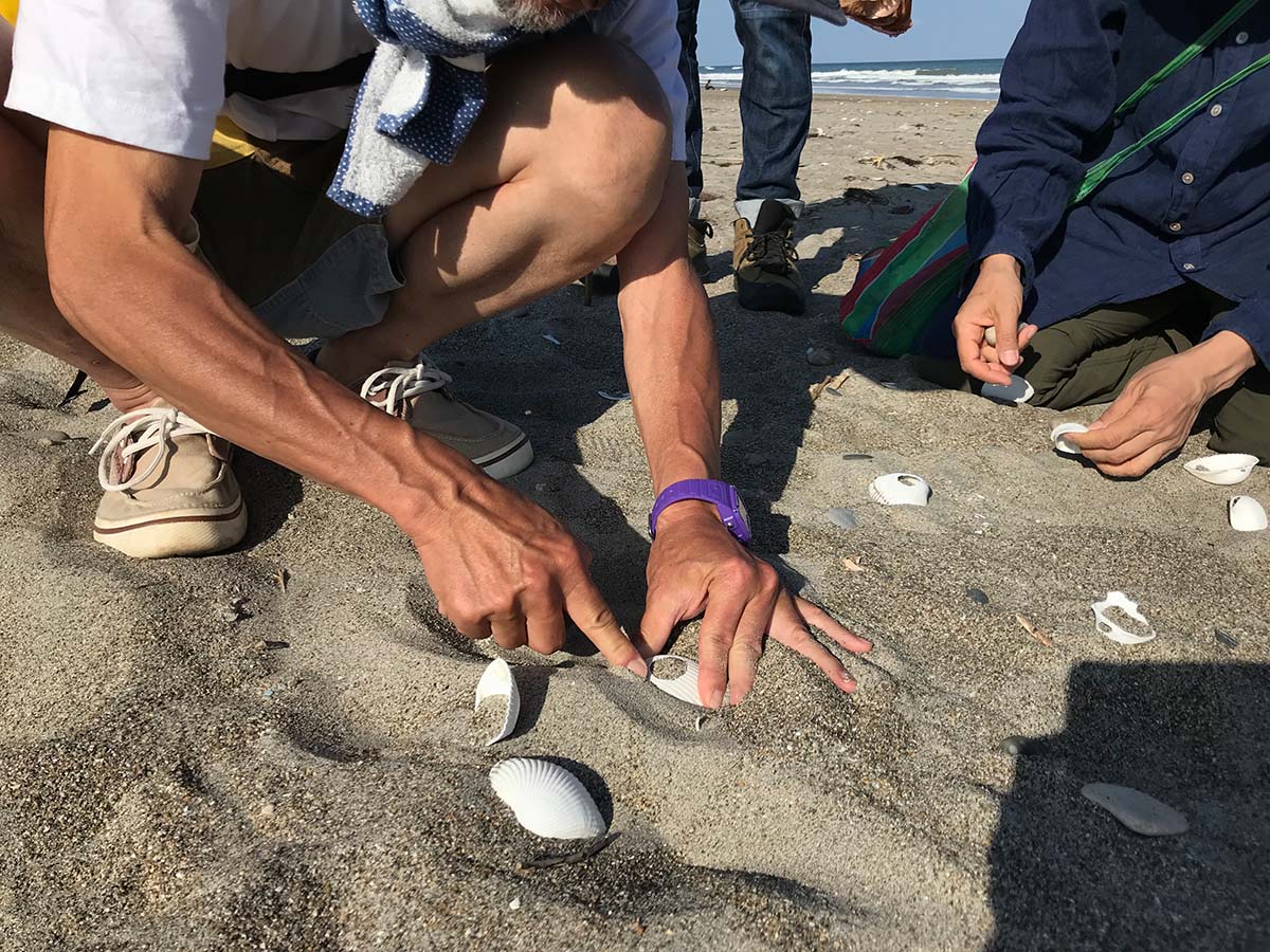 これから皆でこの土地をリサーチしていくにあたって、まずは潮風と潮騒の吹き荒ぶ太平洋側の海岸に立って、荒波の打ち寄せる外海を眺めながら、古代から営まれてきた海を介した繋がりを想像するところから始めたいと考えた。また、縄文時代には太平洋岸に打ち寄せる大きな貝を採取・加工して貝輪を作り、交易品としていたと聞き、考え始めていた移動や交易という方向性に可能性を感じた。