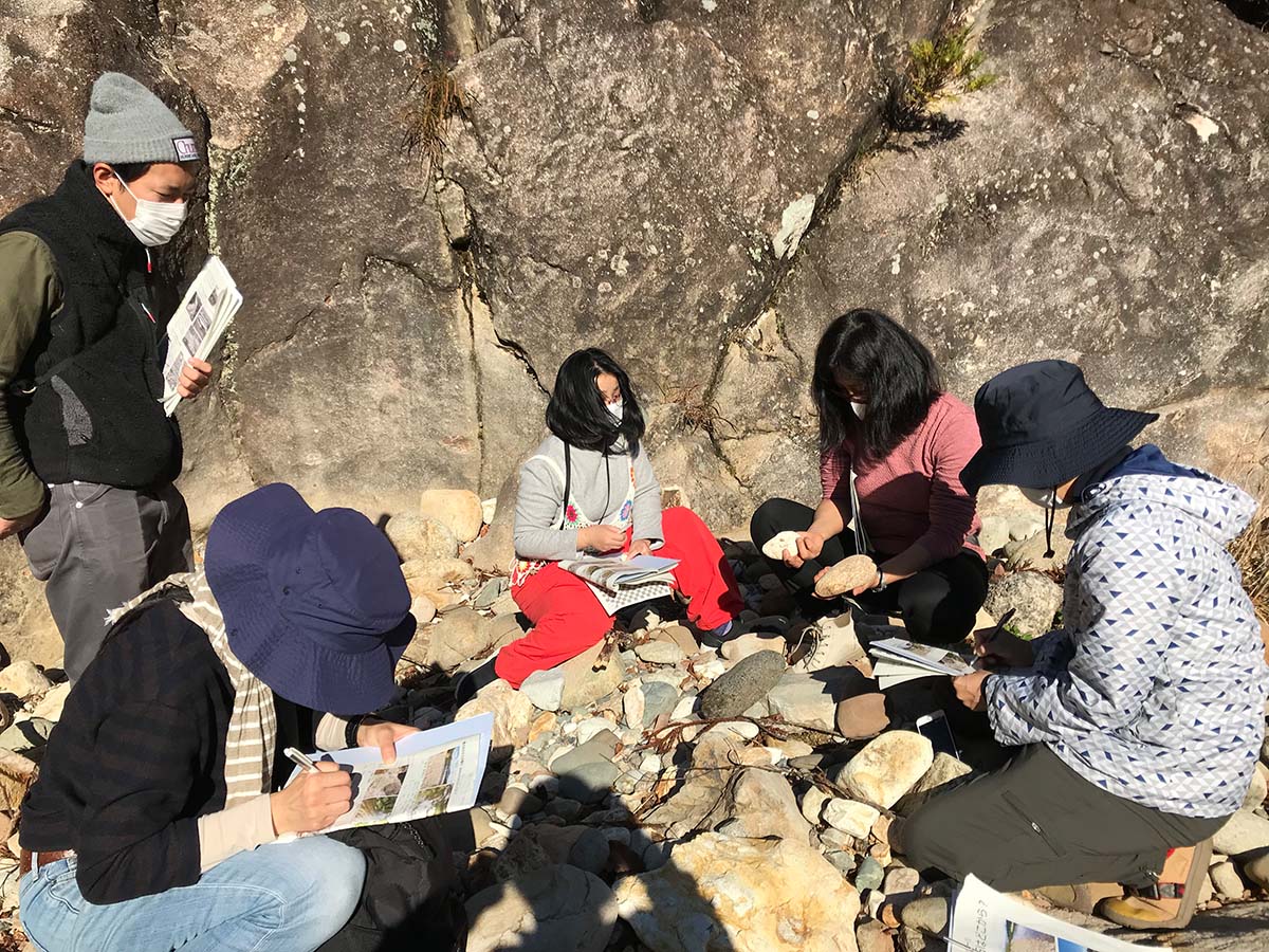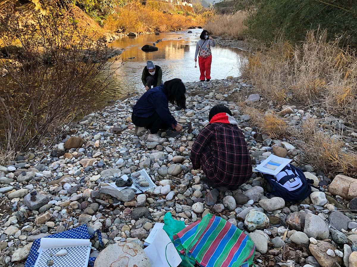 豊川の河口付近から上流へ。土地や成り立ちや、河原の石の来歴を聞きながら石を観察・採集する。