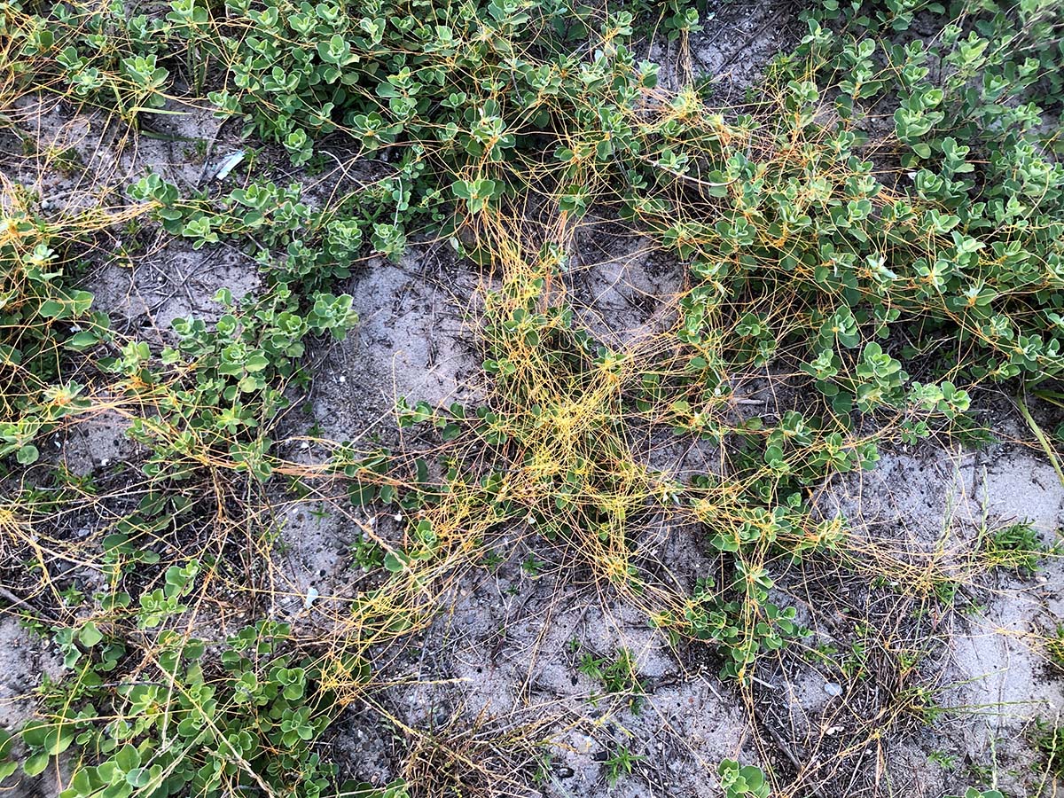 海岸に高さ20mくらいの砂丘が出現している。赤羽根ではハシボソミズナギドリの骨を発見。タスマニアで秋冬に大量に繁殖し、太平洋を北上しベーリング海へと長い旅をする渡鳥。淘汰されて強い種が残っていくそう。西ノ浜では、ハマゴウの上にオレンジ色の繊細な漁網が広がっていると思ったら、寄生植物のアメリカネナシカズラが巻きついていた。北米からの外来植物で、穀物や砂防用植物の種子に混じってやってきたらしく最近問題に。直線的な地下茎がまさにNetworkのようで、今回の移動や繋がりなどのテーマを体現するのに適していると感じる。試しにハマゴウから引き離して持って帰るが、やはり枯れてしまった。
