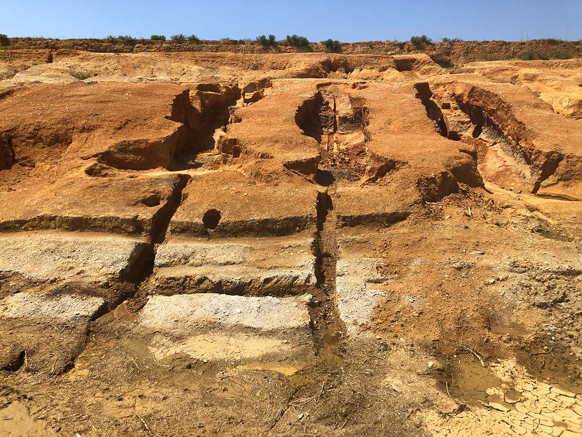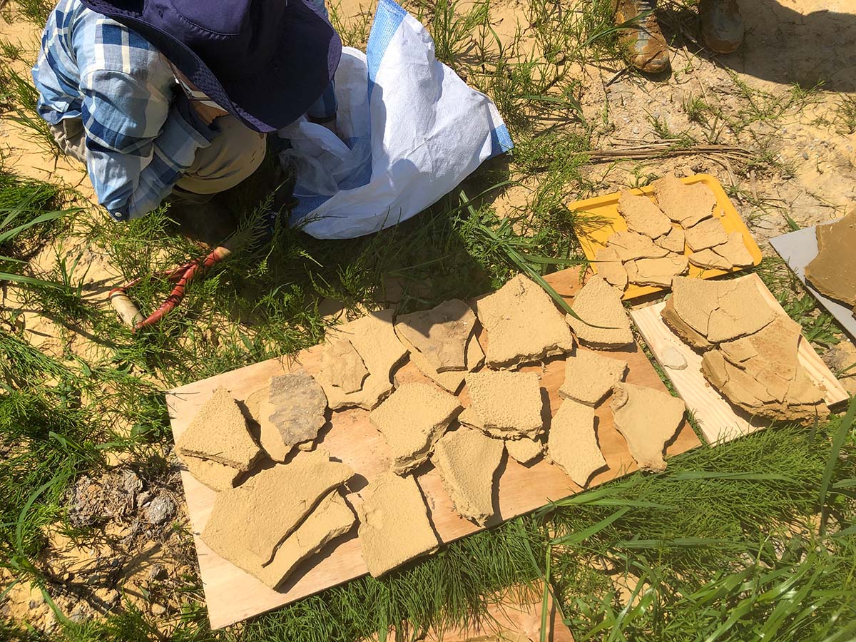 薮の中にひっそり存在する中世の古窯跡では、ドーム状の穴窯の一部がその姿を留め、周囲に割れた山茶碗や陶片が散乱していて興奮する。切り立った崖で粘土を採取。地層の一部が粘土層になっていて、この土地の成り立ちと直結していることを実感。また丘陵地で発掘調査中の穴窯跡に遭遇し、かつての光景が偲ばれる。足元には、風雨で流れ出した土が天日乾燥されて陶片ならぬ「土片」が出来ている。後日、その土片に渥美焼で使われていた紋様や、平安時代の歌僧が窯業の盛んなこの地を訪れた際に詠んだといわれる歌を線刻して焼いてみた。