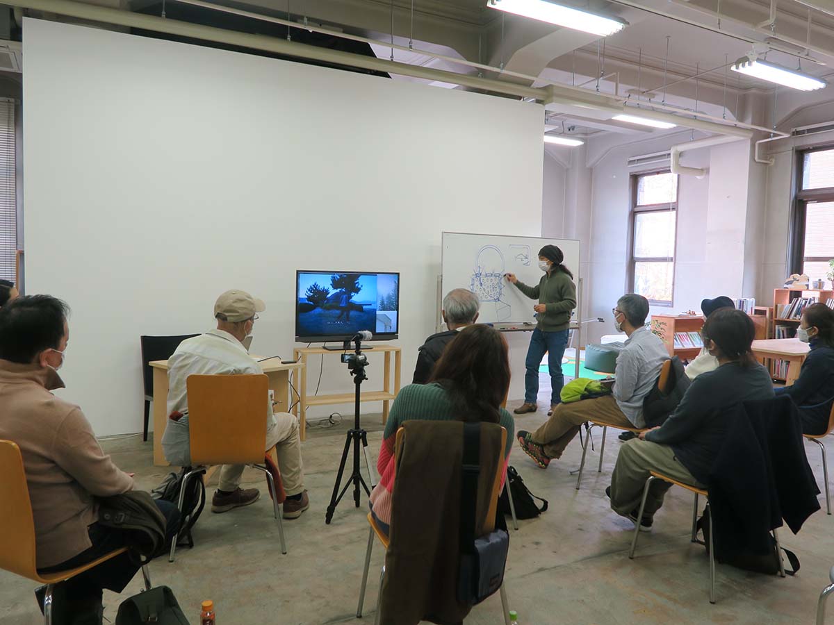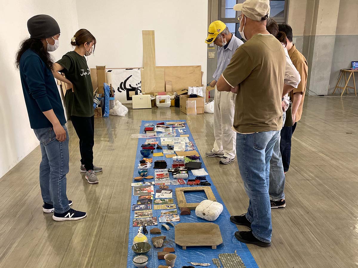 今回は名古屋市博物館の常設展「尾張の歴史」の見学からスタート。常設展内の特集企画で屏風や郷土玩具などを見学し、「愛知」を様々な視点から見るヒントをもらう。後半はアートラボあいちに戻り、年末に眞島さんから出された宿題「壁画のプランを何らかの形で持ってくる」のプレゼン発表を行う。ワークシートに現段階で考えられるプランを口頭で発表。空き箱や透過フィルム、生活から出るゴミを工作してプランを持ってきたメンバーもいた。
