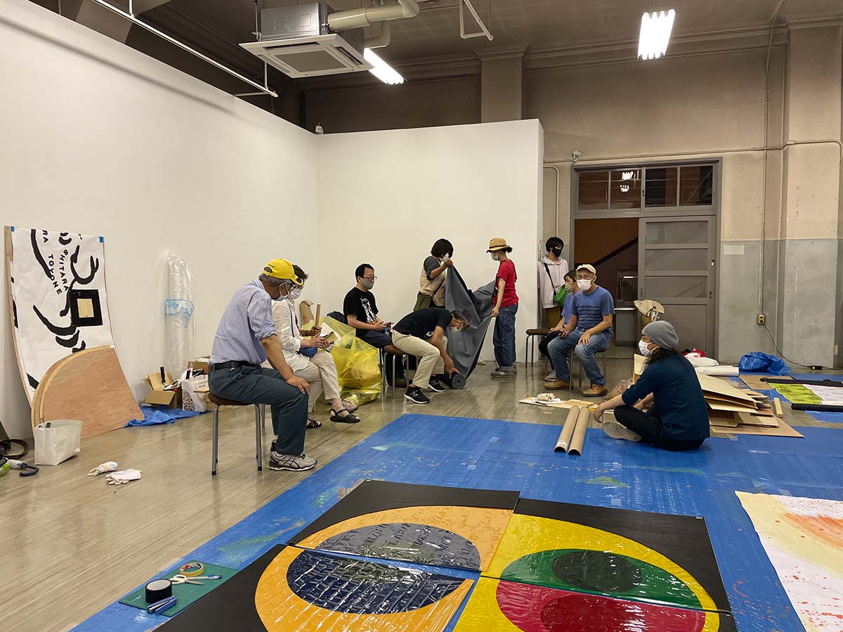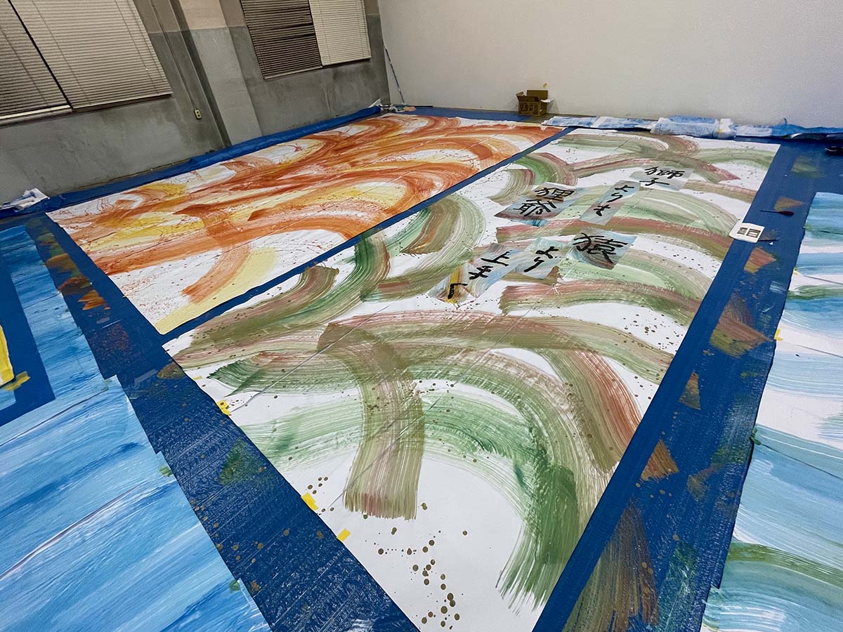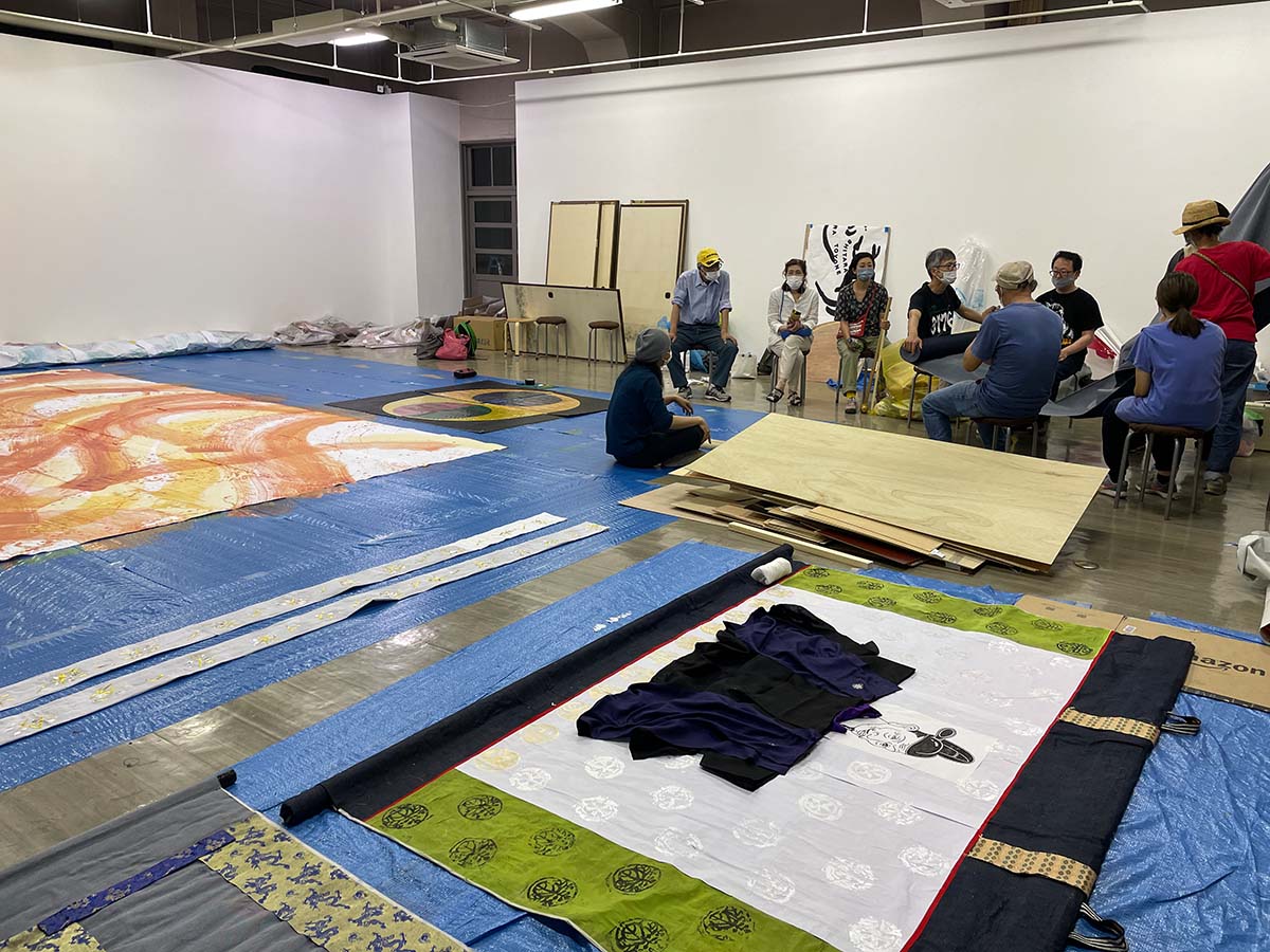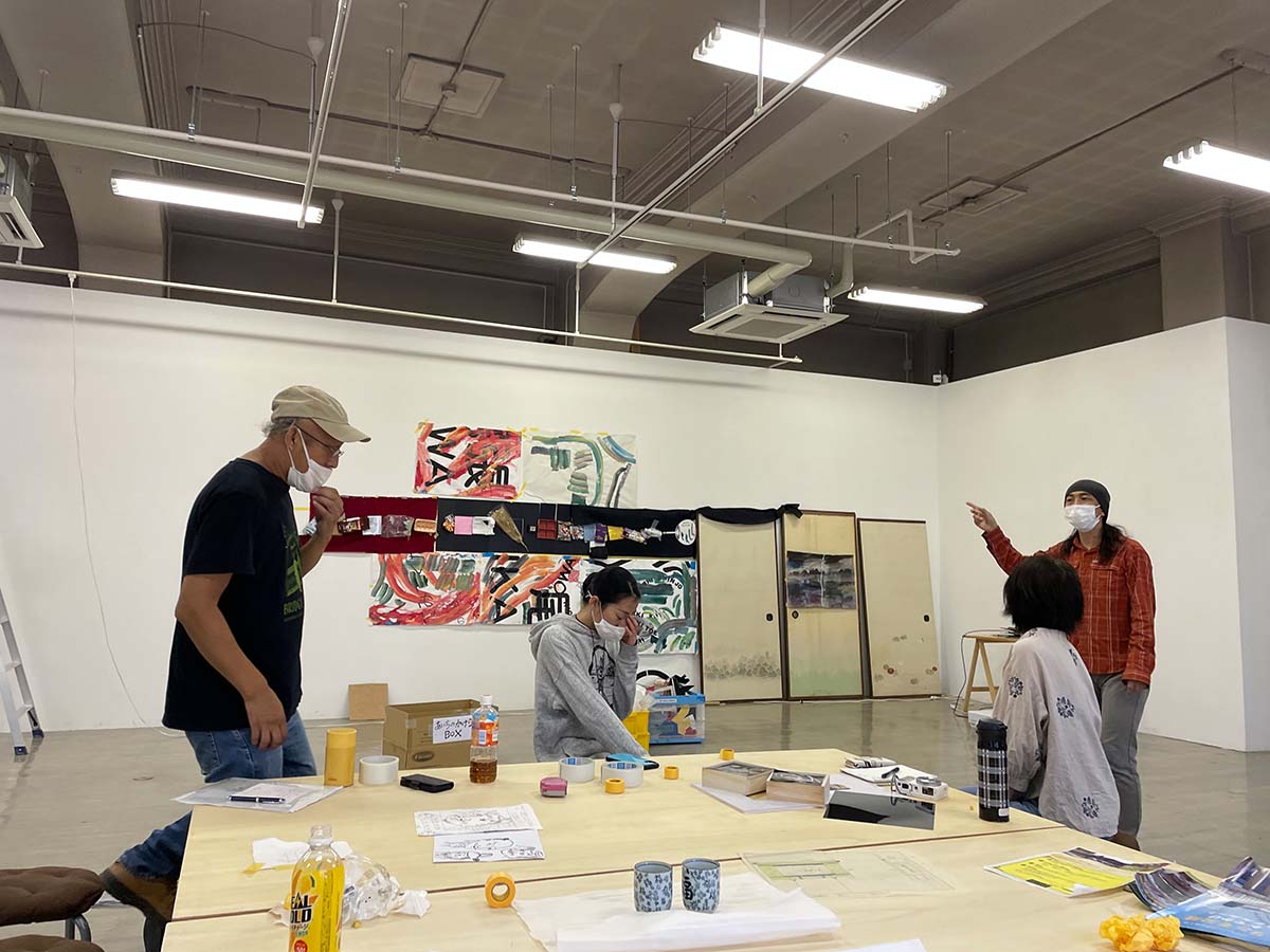 アートラボあいちの3階を制作拠点に、「図」を担当するチームは集まってきたパーツを土台のサイズに合わせ壁画として仕上げていく。「地」を担当するメンバーはモップを使って大きな絵画を仕上げていく。3つの掛け軸と「光る窓」を制作するメンバーは各自のペースで作業を行っていった。後半は搬入の準備や搬入に同行し、芸術祭のインストーラーが設置していく壁画の完成を間近で見守った。