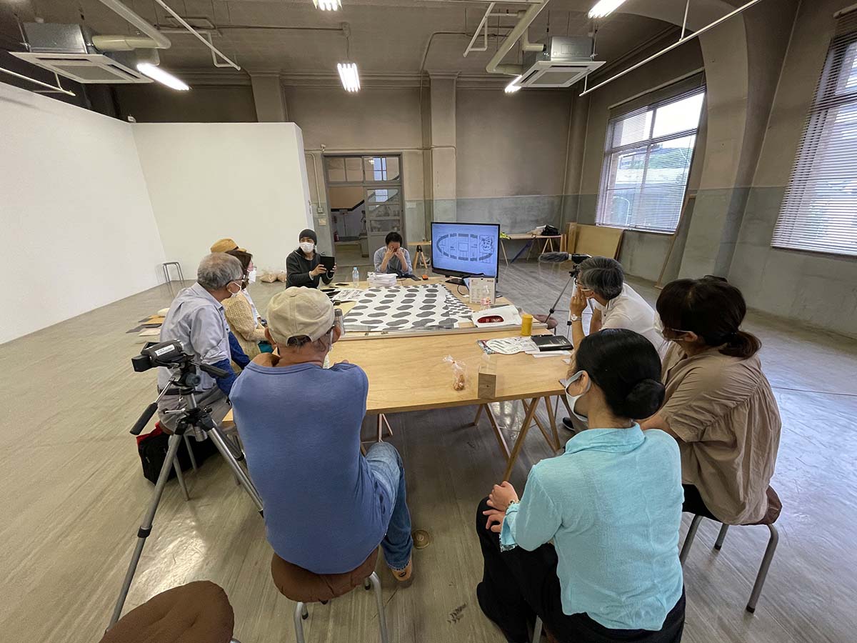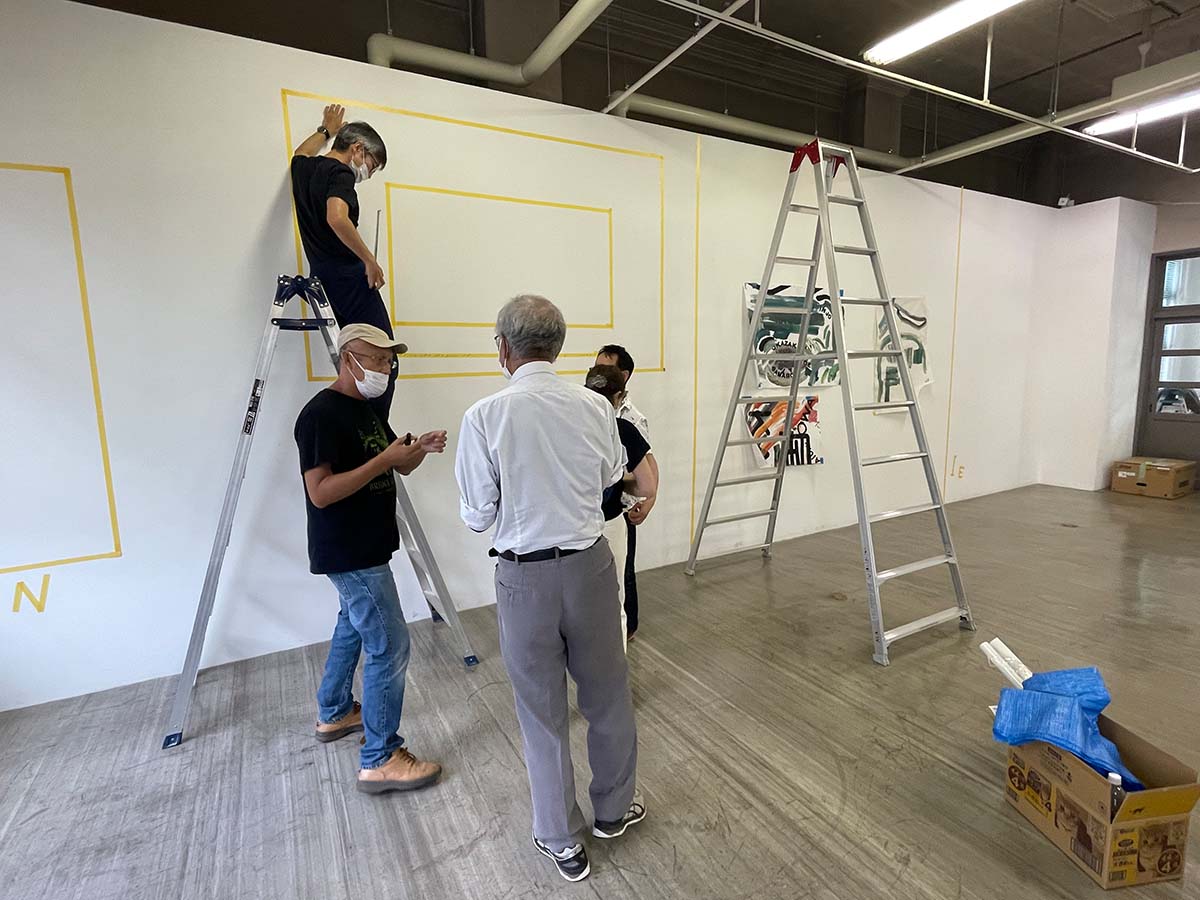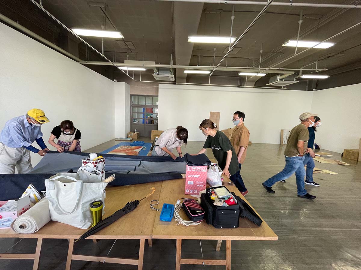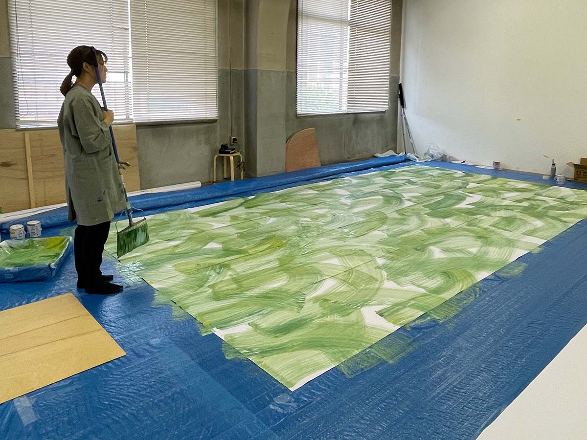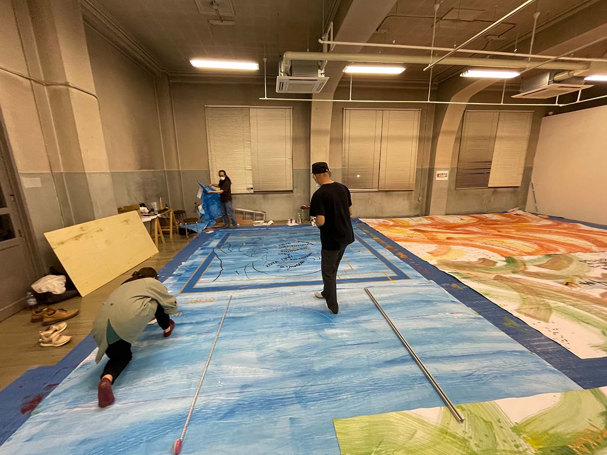 アートラボあいちの3階を制作拠点に、「図」を担当するチームは集まってきたパーツを土台のサイズに合わせ壁画として仕上げていく。「地」を担当するメンバーはモップを使って大きな絵画を仕上げていく。3つの掛け軸と「光る窓」を制作するメンバーは各自のペースで作業を行っていった。後半は搬入の準備や搬入に同行し、芸術祭のインストーラーが設置していく壁画の完成を間近で見守った。