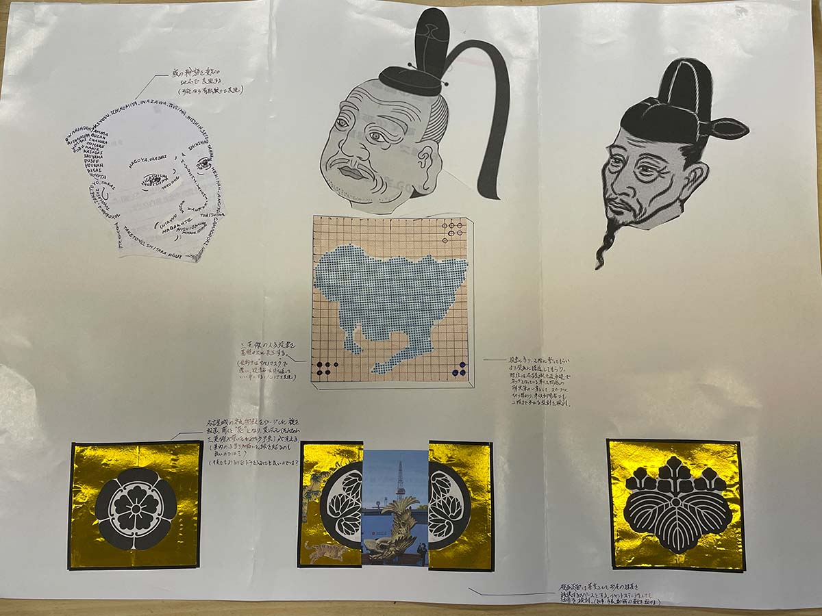 Zoomでの活動が続いたので、いつも以上に対面でのコミュニケーションが活発に行われた。壁画を遠くから見たときの「大きな絵」としてどのような全体像にするのか、各要素についてもディスカッションを行い全体のプランの方向性を絞っていった。また宿題となっていた壁画の素材について、それぞれ持ち寄ってきたものを確認していく。素材は圧倒的な数をどのように集めるか議論された。メンバーのなかにはボランティア登録をしている人も多く、ボランティアの力を借りられないかというアイデアも出る。また、完成した壁画で三英傑の人気投票を行い、その投票数によって壁画が変化するといったアイデアも生まれた。素材については、それぞれ担当を振り分け、企業への協賛へ向けて動く準備を行った。