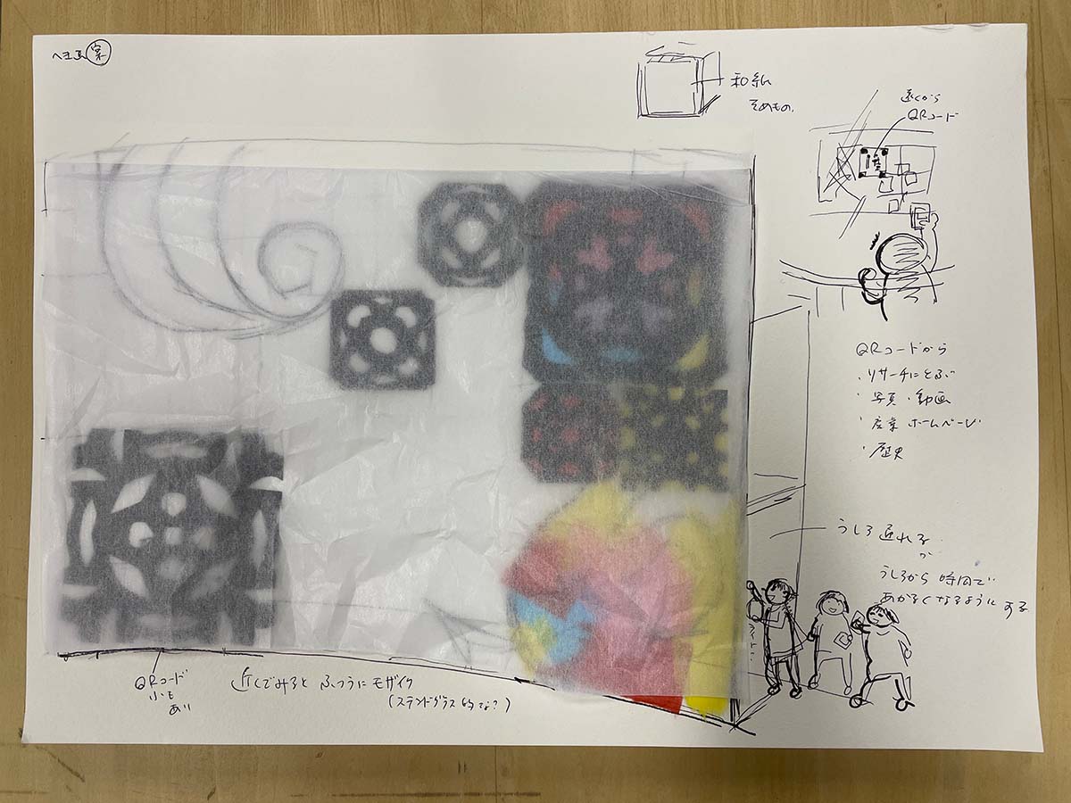 眞島さんより決定した壁画の土台にこれまでメンバーからできたアイデアを落とし込んだプランが共有された。また土台が5分割されている特徴を逆手にとって「横の繋がり」や「遠近」「レイヤー」を取り入れたようなプランをどう作ることができるか、ディスカッションを行った。