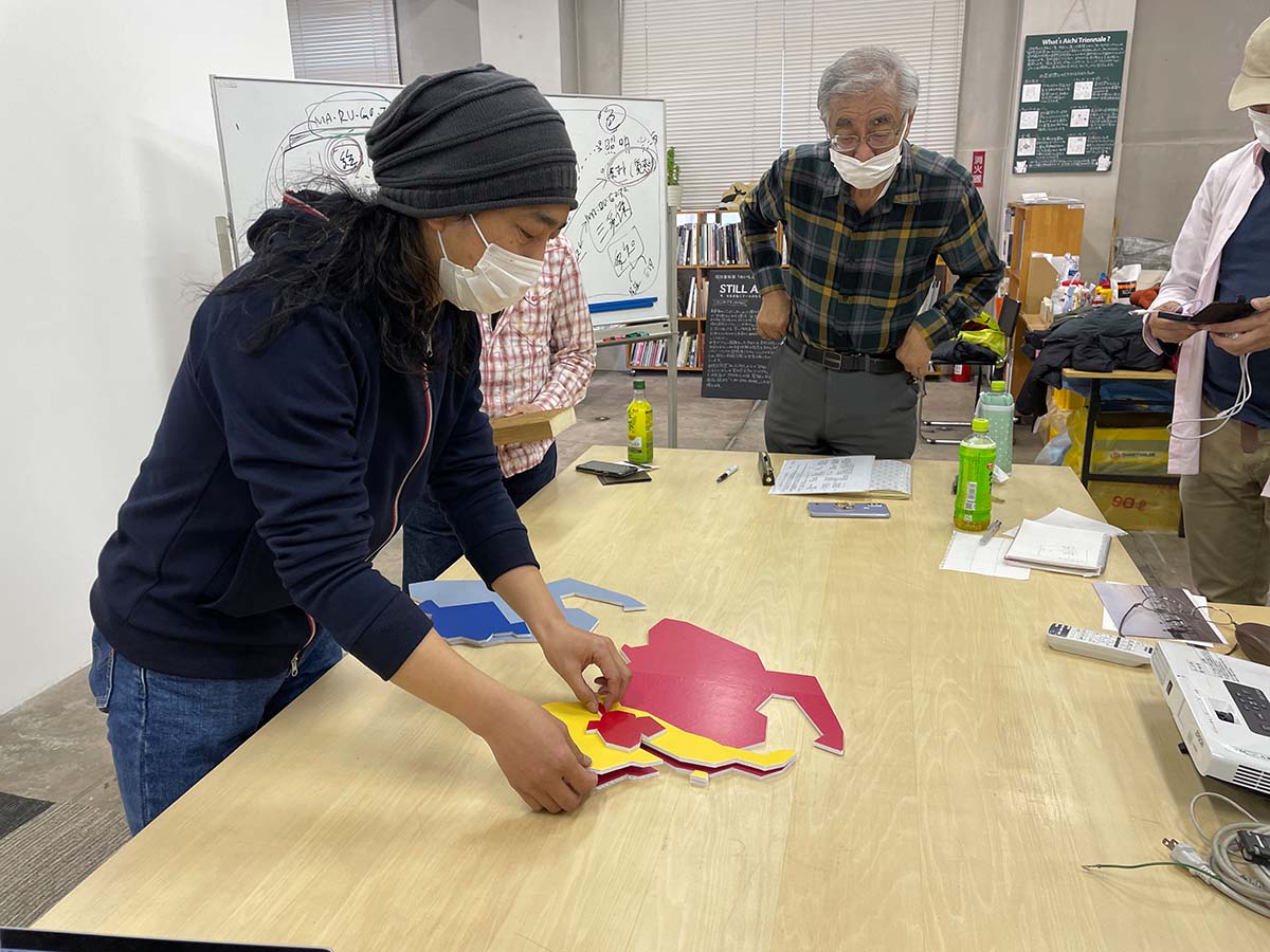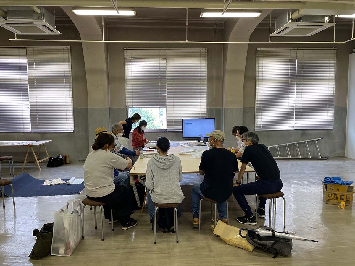 眞島さんよりこれまで交わしたディスカッションを元に壁画の全体像をまとめた具体的なプランが共有された。また壁画を「地」と「図」に分け、決まった内容をそれぞれのパートに分け分担してつくっていくことが決定。パートは、地、図、掛け軸、襖、川柳、光る窓、衣装、イベント、といったメンバーそれぞれが発案したアイデアを実現することになった。「図」のかたちについては「愛知県の輪郭をイメージするかたち」と、「楕円」の二つが候補にあがる。