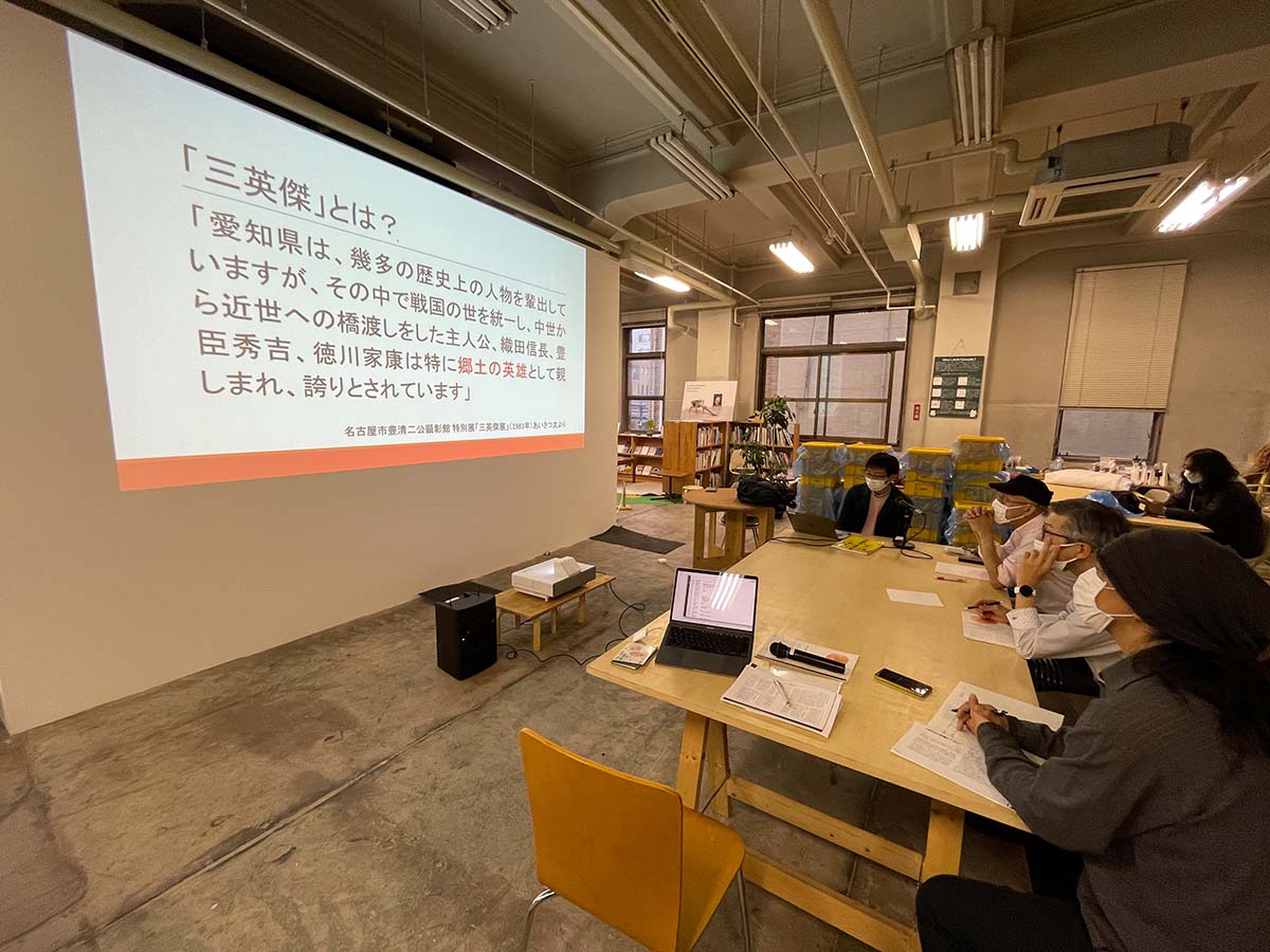 名古屋城調査研究センター学芸員の木村慎平さんにレクチャーに来ていただいた。木村さんには「郷土の『三英傑』の成立」というテーマでお話をしていただき、『三英傑』が示す意味を歴史的な視点から紐解いていった。壁画で表現する「愛知」をどうまるごと取り入れるか、近代的枠組みからの歴史的・概念的な「郷土」をめぐる視点を踏まえたことが、壁画のプランに刺激を与えたようだった。
