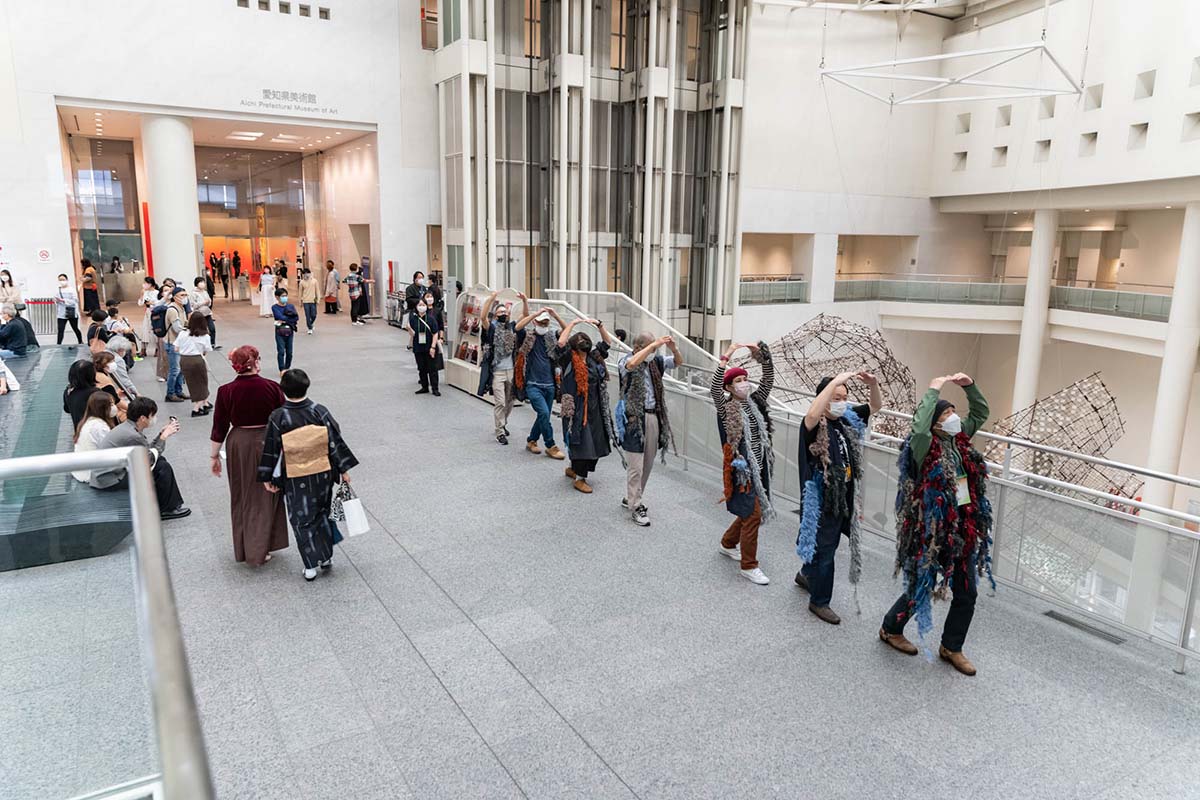 前半はメンバーと眞島さんとが座談会形式で、果たして巨大壁画は「あいち」の「まるごと」を表現できたのか、プロジェクトを経て「あいち」の「まるごと」をどう理解したのか、それぞれが自由に発言しながら振り返りを行った。また、後半は「壁をとび出せ!MA・RU・GO・TO あいち!」と題し、巨大壁画を制作するプロジェクトとしてスタートした「MA・RU・GO・TO あいち feat. 三英傑」を、パフォーマンスとして上演した。一宮の生地製造の過程で生まれる「生地耳」を身にまとったパフォーマーたちが、「まるごと」「あいち」と唱えながら壁画周辺を練り歩き、「壁画/パフォーマンス」「展示/上演」「もの/こと」の垣根をこえて「あいち」の「まるごと」を表現した。