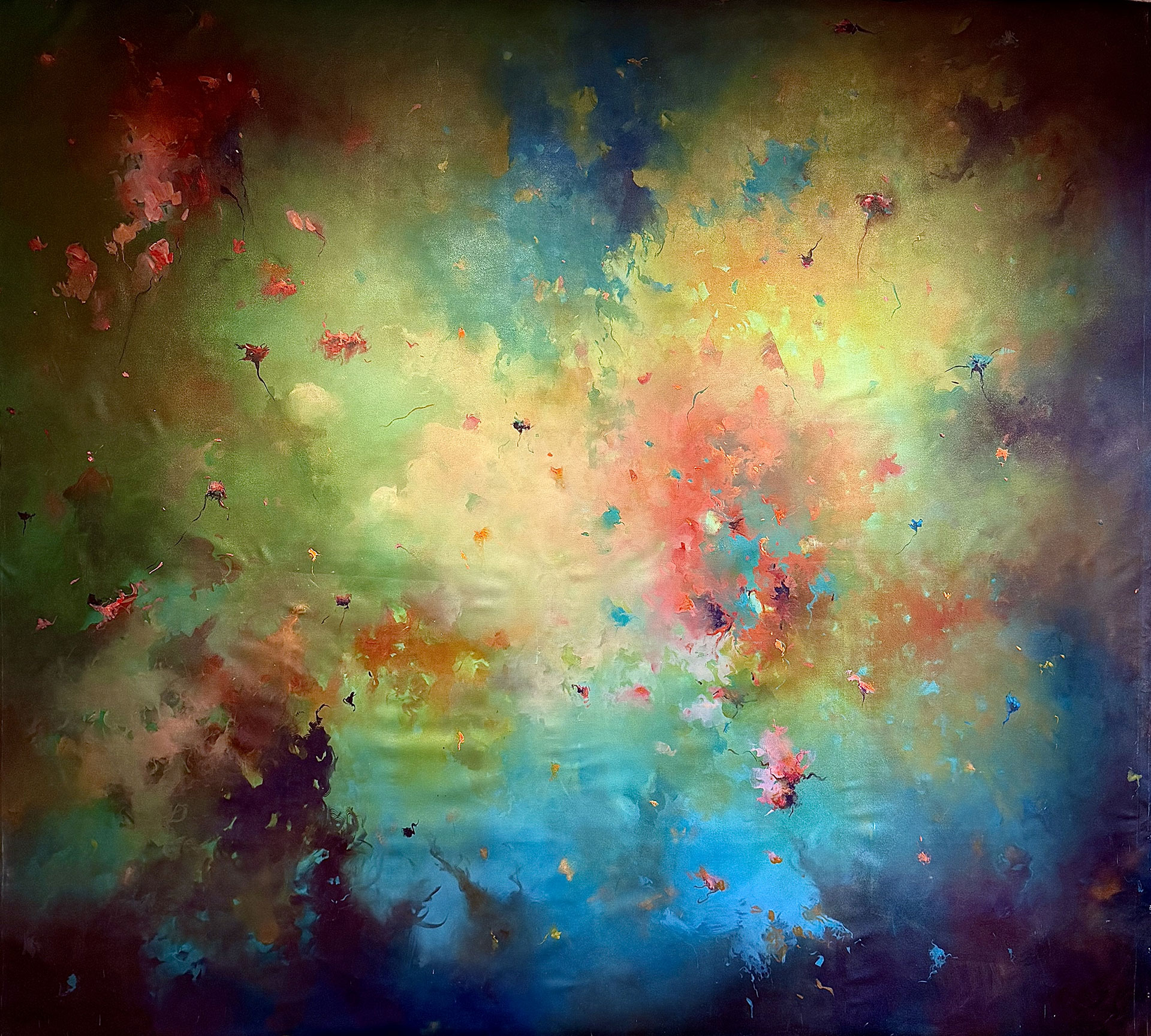 新たに制作された《新たな誕生》、《空の寓話》および小型の10作品には、これまでより鮮やかで明るい色彩が用いられています。描かれた花々は、爆風に飛ぶ最後の生の瞬間のようでもあり、あるいはささやかに力強く咲き続ける姿のようでもあり、まさに「灰と薔薇のあいまに」というテーマを体現し、刹那を生きる命の儚さと尊さを強く感じさせます。