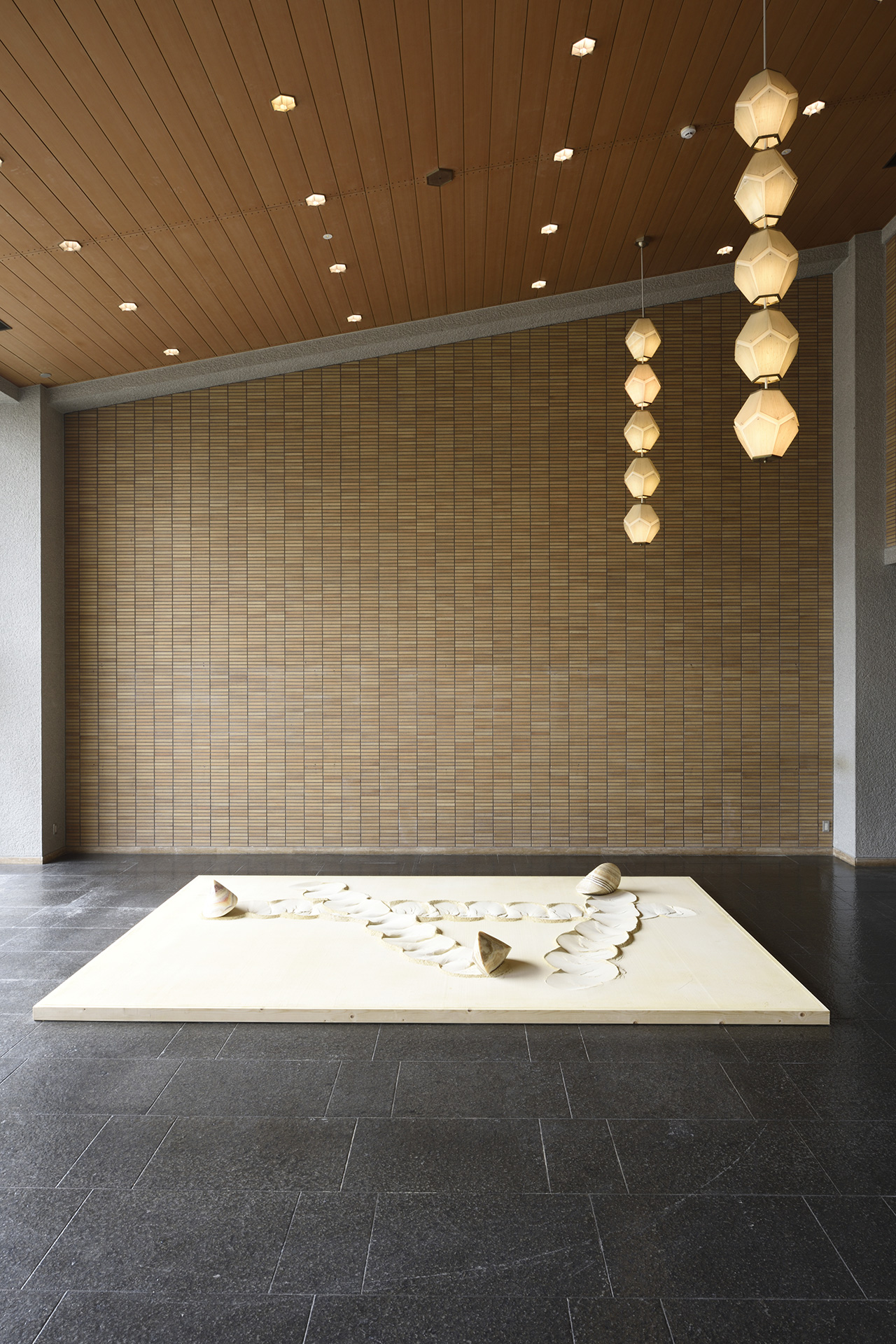 代表作の〈Relieve〉シリーズは、降雨によって砂や鉱物が形を変えて再び乾燥して硬化することで、地形が生まれる様子を想起させます。土壌に痕跡を刻む幾何学的なかたちのオニキス「オロイド」は、地質学的な時間軸で環境に応じて姿を変える物質の象徴でもあります。同じシリーズの一環である本作には、瀬戸の窯業を支えてきた蛙目粘土や珪砂、酸化鉄を含んだ黄土といった地元の原料が使われています。一見これらの原料は変化しないもののようにも思われますが、実際には長い年月をかけて、風化、堆積という物理的・化学的な分解の過程を経て現在の姿に至っています。