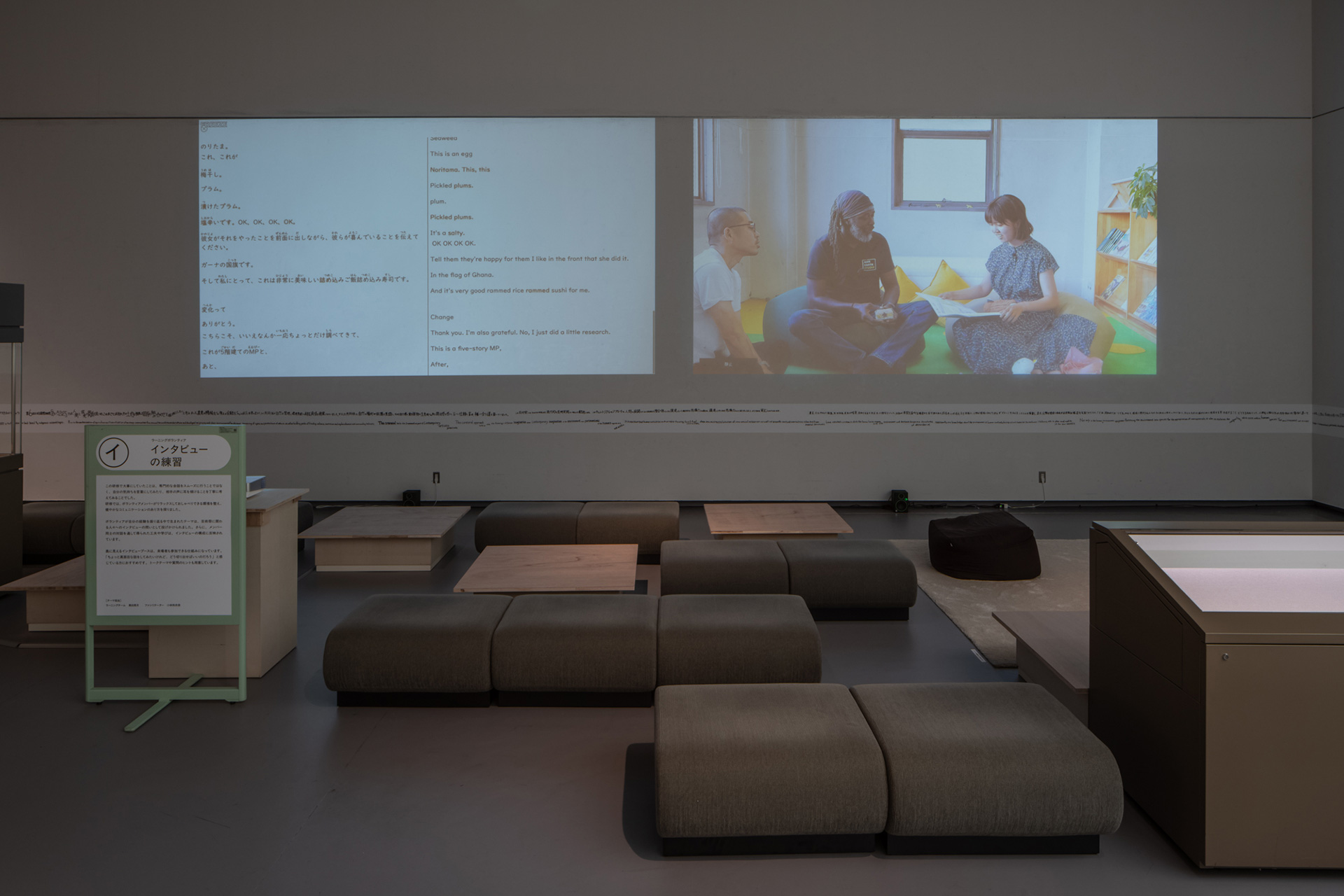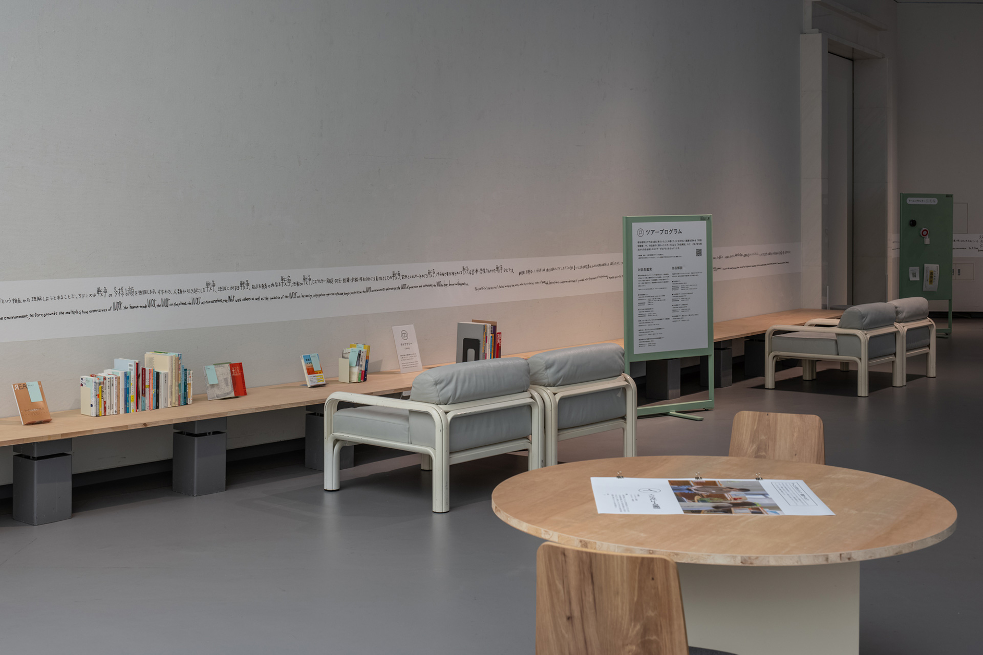 ラーニングセンターへたちにおいてあるソファーやパーテーションなどの家具たちは、もともと同じ建物の中にある愛知県美術館をはじめとした愛知芸術文化センター内で使用していたものを借りたり、譲ってもらったりしたものたちです。これらの家具たちは、会期中一時的にここに集められ、人々に使われたあと、会期終了とともに元の場所に戻っていきます。展示室Jにとどまらず、愛知芸術文化センターという建物自体もラーニングセンターへたちを通して知ってもらえるような設えをめざしています。