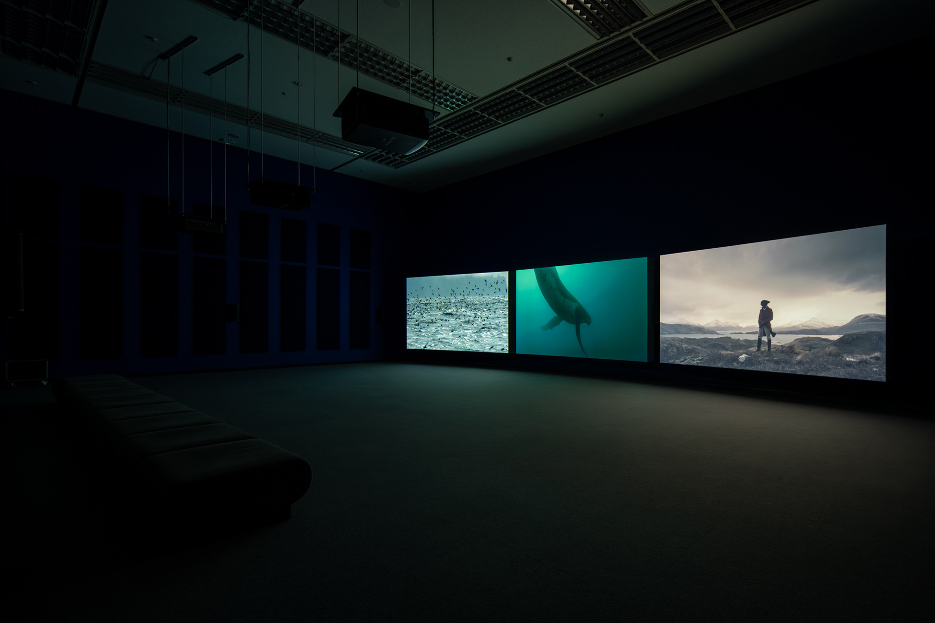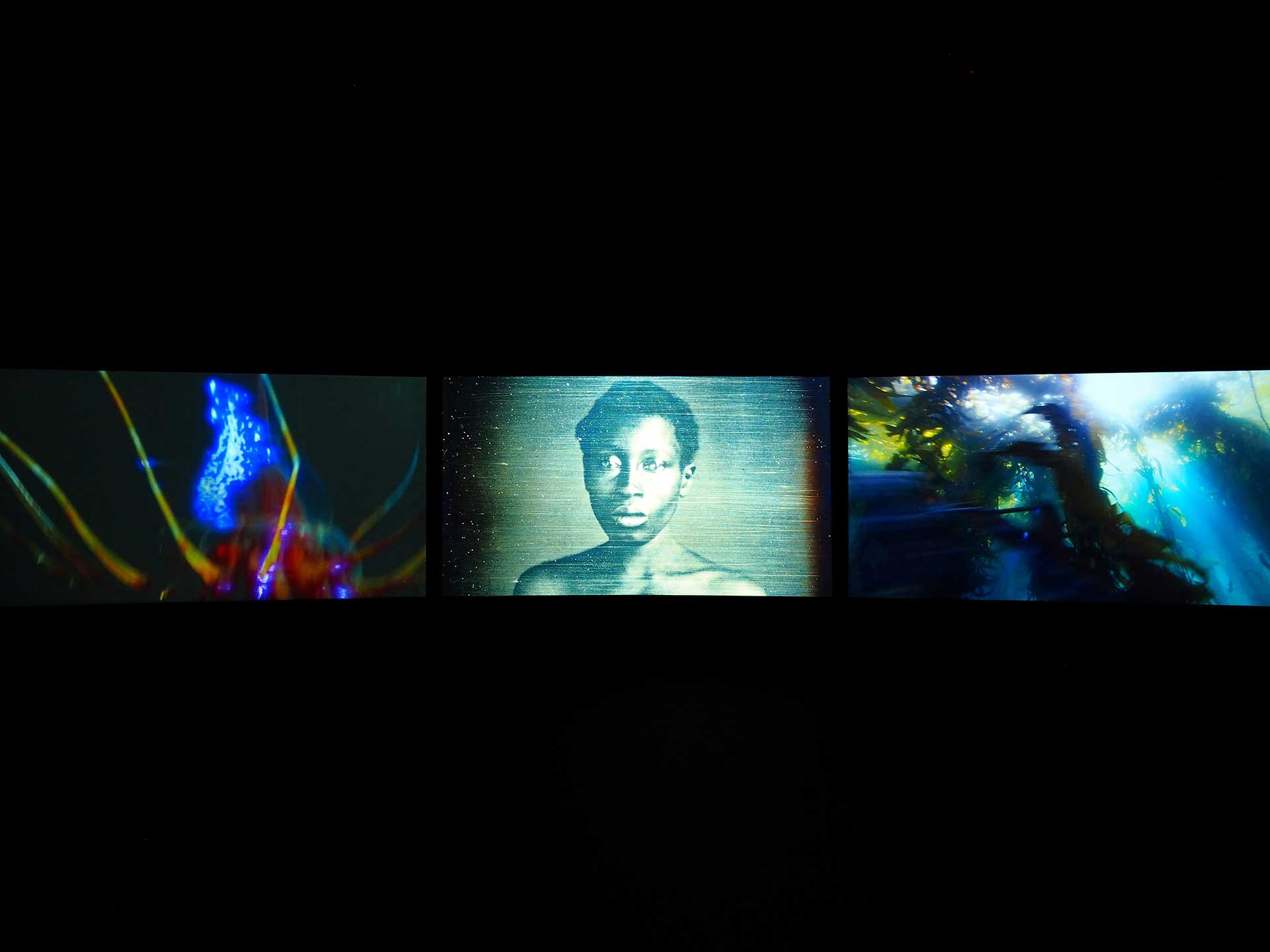 ジョン・アコムフラの3チャンネル映像インスタレーション《目眩の海》(2015年)は、人間と海の関係を考察する作品です。地球規模の人の移動、難民危機、大西洋の奴隷貿易、そして生態学的な懸念をめぐる歴史を織り交ぜながら、海を主人公として描く複数の物語を紡ぎ出します。このインスタレーションは、ニューファンドランド沖での捕鯨の暴力的な光景、北極の流氷上でのホッキョクグマ猟、ヨーロッパを目指して海難事故に遭う移民と漂着した遺体、奴隷船の映像、核実験場や深海石油掘削の場としての海といったイメージを並置して映し出しています。ここでの海は墓地であり、美の記憶と並んで、産業による搾取、気候変動、移民や奴隷たちの大量死といった暴力的な光景も宿しています。この作品によってアコムフラは、ベニン王国出身の解放奴隷であり、後に英国の奴隷制度廃止運動家、海商人、北極探検家となったオラウダ・イクイアーノ(1745頃–1797年)の驚くべき物語を語ります。