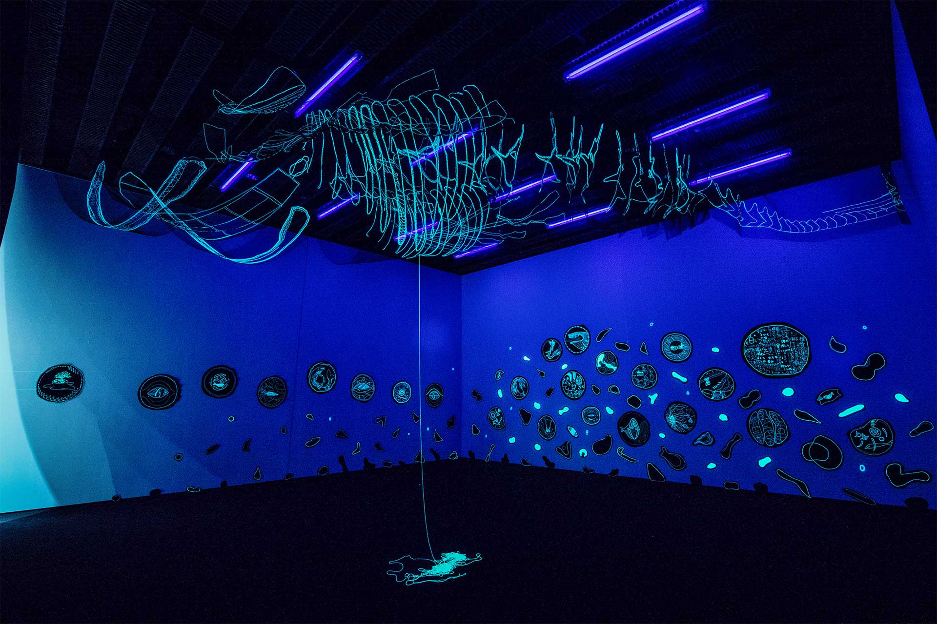 是恒は、愛知県と鯨類のこうした意外に深い関わりを掘り起こし、まちが近代化してゆくなかで忘れられていった鯨たちの姿を蘇らせようとします。海の色に染まった魚網の先に横たわる鯨の全身骨格は、名古屋港に漂着したマッコウクジラの骨や、かつて日本中の地下に張り巡らされた土管、骨を模して制作した塩釉の陶作品などを組み合わせてできています。その上を、もう一頭の刺繡による巨大な鯨がゆったりと泳いでいます。