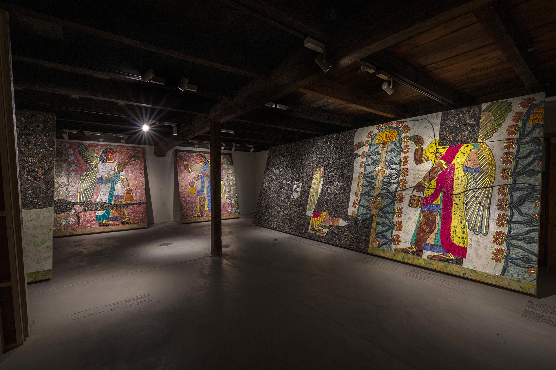 「あいち2025」の展示は、古代アッシリア帝国(現在のイラク北部)の首都カルフ(ニムルド)の宮殿にかつてあった200枚のレリーフパネルを、実物大で複製するプロジェクトのうち7点です。同宮殿は、米国主導のイラク戦争後の混乱期、2015年にISISによって破壊されました。破壊前の宮殿の展示を忠実に再現したこのプロジェクトでは、現存するパネルの保管場所を示すラベルを付した何もない空白部分も重要な要素で、本展の床の空白もその手法を踏襲しています。それらの多くは、19世紀半ばに英国人の考古学者オースティン・ヘンリー・レイヤードによって発掘された後、輸出され、西洋の収集家や博物館によって所蔵されました。これらのメソポタミア遺物の物語は、1941年に祖国イラクから逃れざるを得なかった作家自身の家族の歴史と重なります。ラコウィッツは破壊前日の宮殿の姿を可視化することで、失われた壁画とともに暴力的に故郷を追われた人々を偲びます。よく見ると、壁画は中東諸国から輸出された食品パッケージや、米国やディアスポラコミュニティのアラビア語の古新聞紙といった素材でつくられていることがわかります。こうした使い捨ての素材は、長きにわたって伝わる遺物の儚い運命を強調しています。