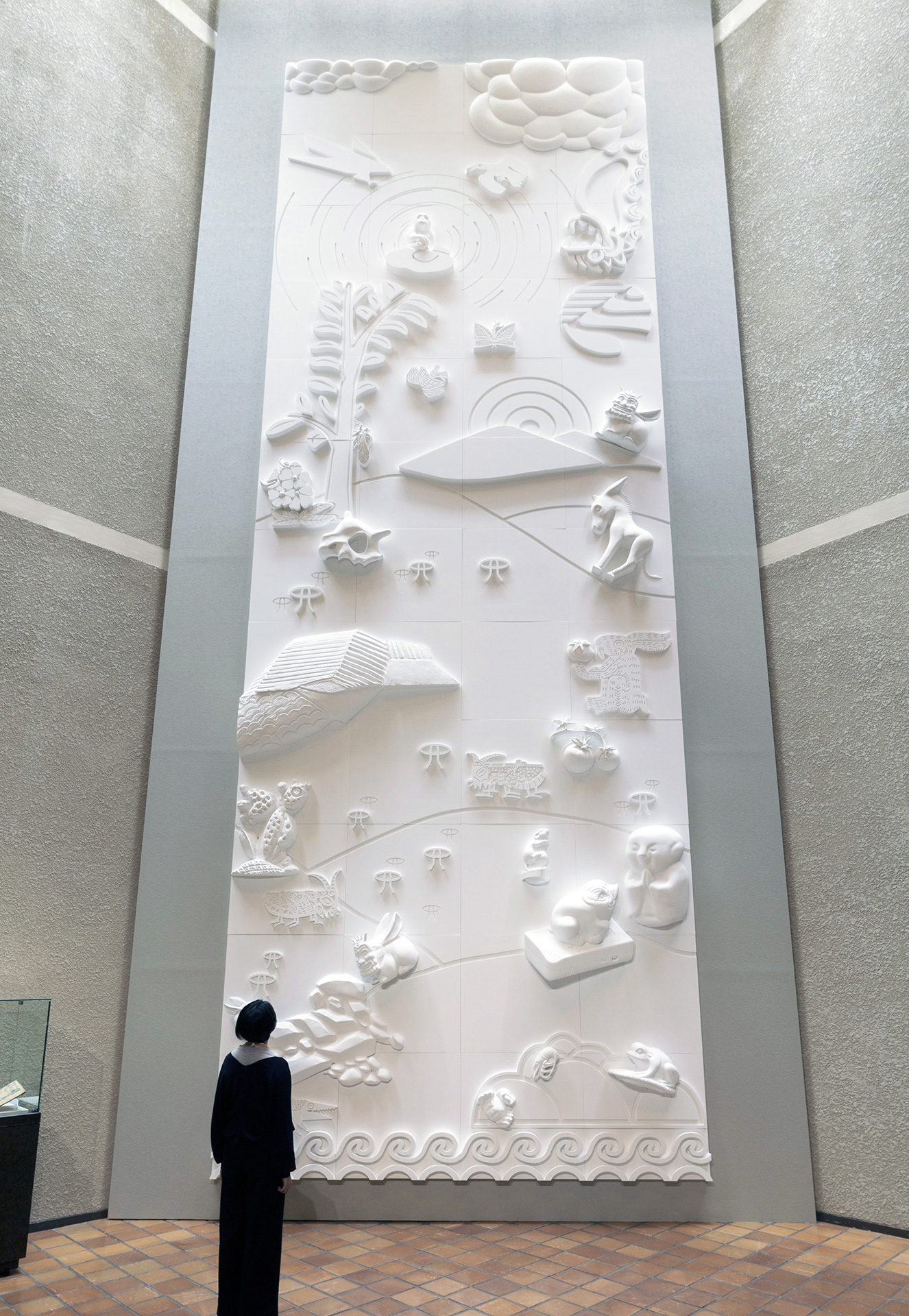 「あいち2025」において、クエバスは瀬戸市の文化芸術の発信拠点・瀬戸市美術館の入口に、高さ11メートル、幅4メートルにも及ぶ大規模な壁画を制作しました。この壁画には、1921年から1936年にかけてメキシコに滞在した瀬戸ゆかりの画家・北川民次(1894-1989)の作品から着想を得たモチーフが多く取り入れられています。北川はメキシコ壁画運動や野外美術学校のあり方に強い影響を受け、帰国後の日本でも美術教育に熱心に取り組みました。クエバスの新作壁画に登場する動物やゲームのキャラクター、企業ロゴなどの象徴的な要素は、瀬戸において北川の存在がもっている文化的意義や、美術教育者として彼が子供たちに向けたまなざし、さらには大航海時代以前のメキシコ文化と現代日本の文化などを想起させるものです。