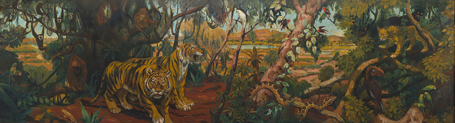 古代ペルシャのパラデイソスや旧約聖書のノアの方舟が示すように、古くから人間はあらゆる動物を集めたいという欲望を持ってきました。しかし、生活圏の異なる複数の動物種を一望できるこのようなパノラマ世界は、現実には存在しません。また、動物種の確保の歴史は、他国の資源や富を収奪する植民地主義と切り離すことはできません。当時子供たちの目を楽しませた3枚の壁画は、現実と虚構のあいまで今、何を物語っているのでしょうか?