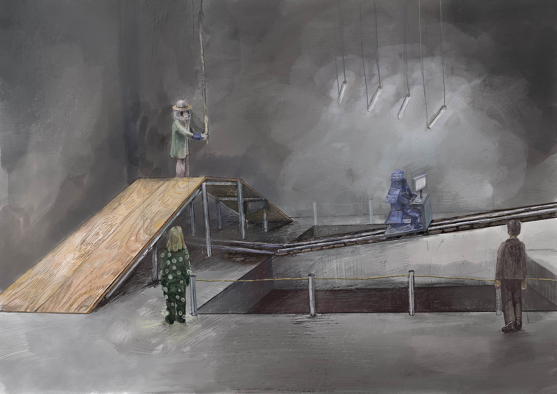 1984年福井県生まれ。2010年多摩美術大学絵画学科卒業。舞台装置、インスタレーションなどを設計、製作。メンバーのアイデアは一旦、設計を通して現実的な空間に全て捩り込む。捩じ込む過程で別の思考回路が広がることを意識して製作している。