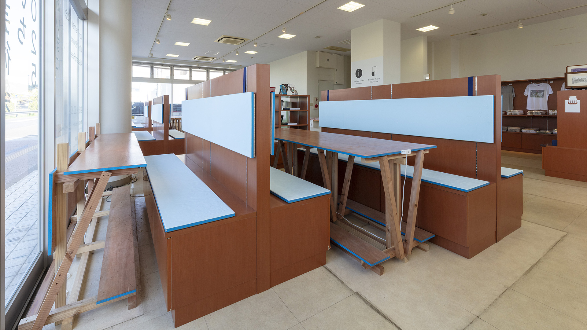 ラーニングセンターせとは、老舗の国内向け陶磁器卸売・小売店であった旧小川陶器店を利活用し、芸術祭のインフォメーションセンターと共同で運用します。センター内の什器には、もともと小川陶器店で陶器が並んでいた棚を活用します。この特徴的な棚を座席として利用することで、ファミレスのように落ち着いて会話できたり、休憩したり、自習や作業をしたりする過ごし方が自然と生まれるような、心地よい場所づくりをめざしています。
