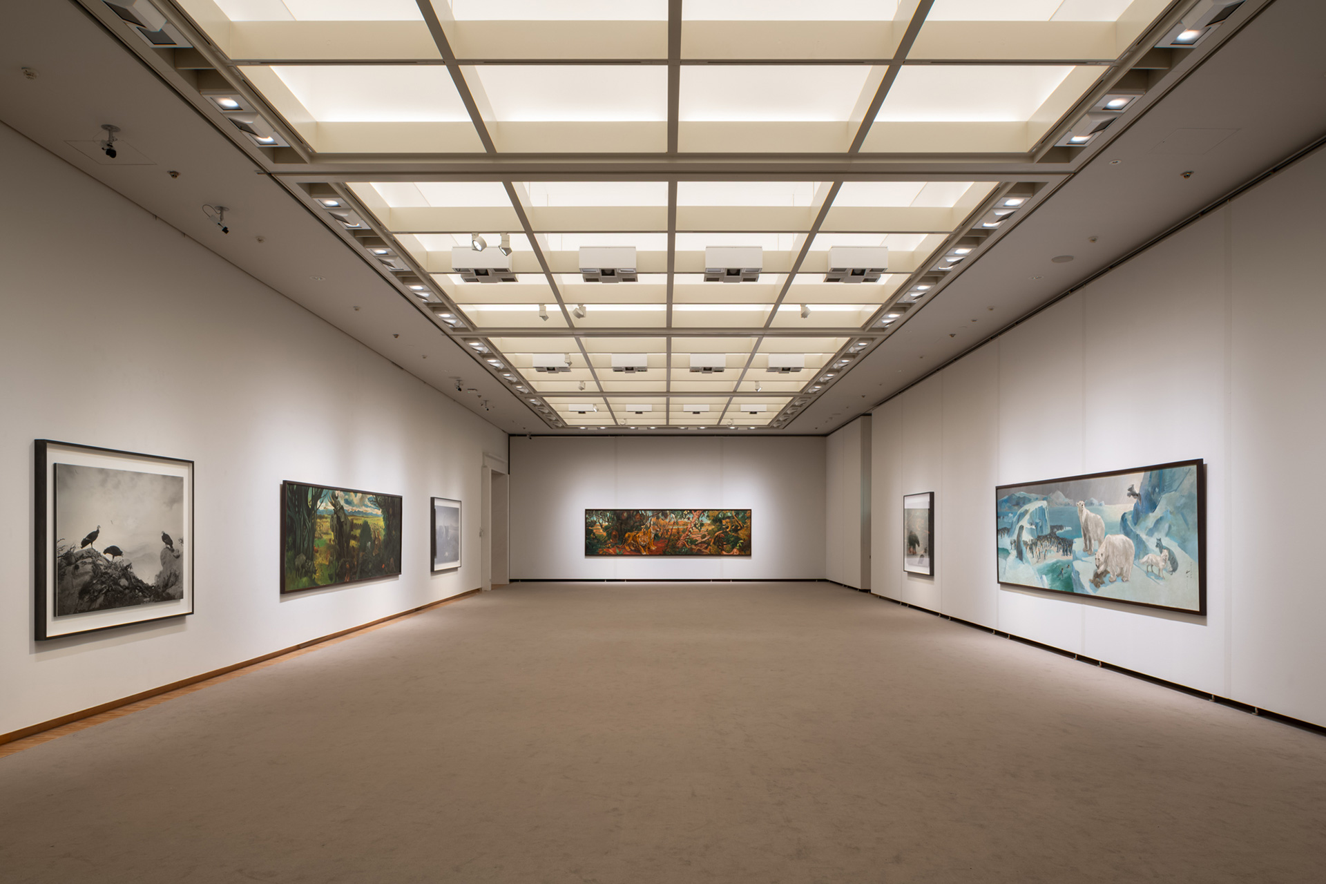 〈ジオラマ〉は、杉本のアーティスト活動最初のシリーズです。1975年に杉本がニューヨークのアメリカ自然史博物館(AMNH)で見たジオラマの精巧さと、そこに生と死が同時に存在している様相に目を奪われたことに由来します。杉本はそれから40年間にわたって米国のさまざまな博物館でジオラマを撮影しました。AMNHのジオラマ製作は1920年代から1940年代が黄金期で、背景画はほぼすべて画家たちが実際の場所を訪れて描かれました。約20分間の露光で撮影された本作は、あたかも生きている動物を撮影したと見まがうリアルさです。撮影と射撃のどちらも意味する英語の‘shoot’から、写真は時に死を連想させますが、本作には失われた生を写真のなかで取り戻そうとする杉本の祈りが込められています。ジオラマは人類が地球にもたらした急激な変化によって絶滅した種や、都市化や戦争で失われた生き物のメモリアルでもあることを想起すると、本作は長い自然史のなかで、杉本が言うところの「ロスト・ヒューマン」(人類後)の世界観を表しているといえるかもしれません。