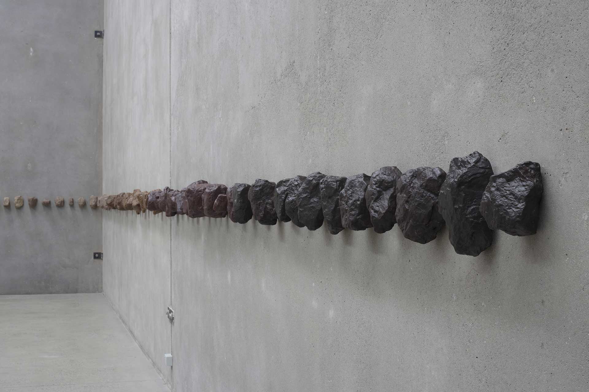 《森》でスミスは、シドニー南部の炭鉱から採取した本物の石炭塊を型流しして陶の彫刻作品を制作しました。これらの釉薬には、オーストラリア東部海岸沿いの11の発電所と、ニューサウスウェールズ州、ビクトリア州、クイーンズランド州の内陸部から採取した石炭の灰(フライアッシュ)を用いています。彼女は2018年のビエンナーレ・オブ・シドニーで展示した際に、シドニー湾にあるコッカトゥー島の石炭火力蒸気クレーンの灰を目にした際に、アクセス可能な限り多くの石炭灰ダムの灰の組成を可視化することを決意したと言います。石炭は、太古の植物が沼や湖の底に堆積し、地中の熱や圧力によって数千万〜数億年の時間をかけて変成したものです。《森》の最古の石炭灰釉薬は3億年前に遡り、最も淡い色合いをしています。より新しい灰釉(1800万~2300万年前)は未だに鉱物成分が豊富で、より豊かな釉薬の色調を示しています。石炭の年代や、様々な環境の要因によって植物に含まれていた有機物と無機物の量の差が、焼成後の釉薬の色の違いを生み出します。こうして立ち現れる灰釉の多様な色味や質感は、遠い過去の植物やその植物が経てきた環境、石炭に変成するまでの時間、そして現代の産業活動における痕跡を、根源的に結び付けています。スミスは、人類がフライアッシュを用いたことで地質学的な記録に与えた影響を、美学的に提示しています。