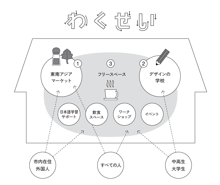 阿部さんと児玉さんが考えたのは、「参加してください、交流してください」という働きかけをする場ではなく、「わくせい版ごはんのかい」がそうであるように各自のタイミングや目的で集まり、新しいユニークな文化が生まれる、クリエイティブな場をつくることでした。そこで計画されたのは3つの要素を持つ「わくせい」です(図6)。