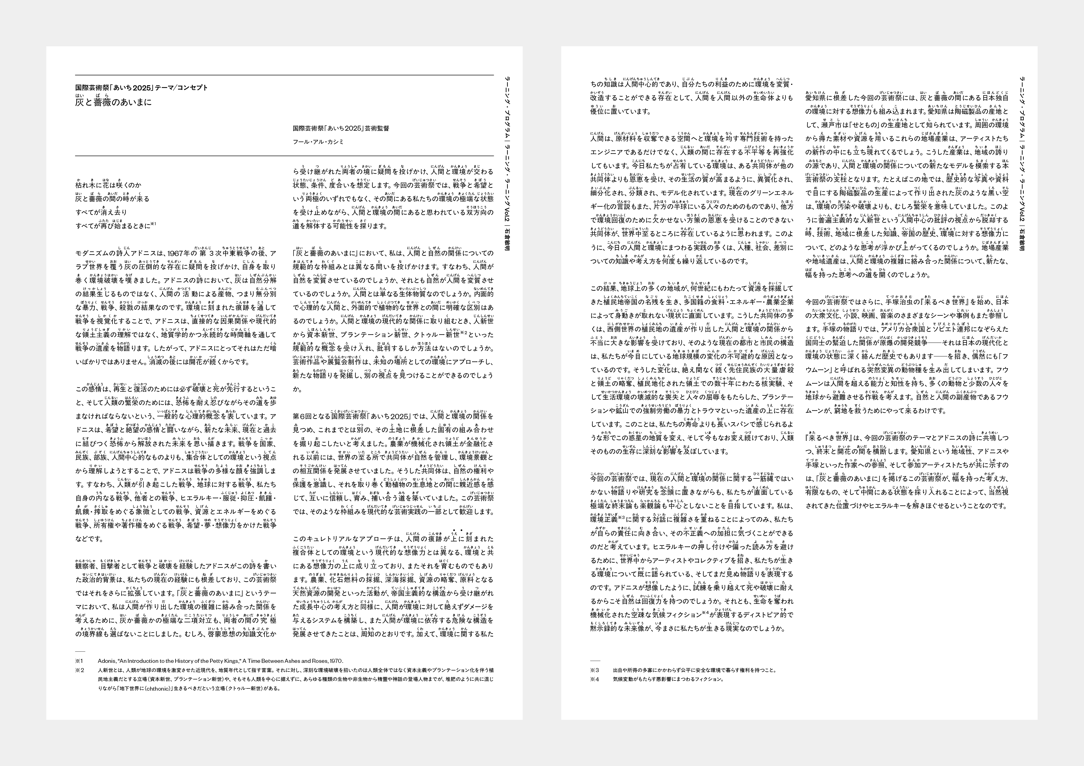 「あいち2025」のテーマをフール・アル・カシミ芸術監督は「灰と薔薇のあいまに」に設定しました。この言葉は、シリア出身の詩人であるアドニスの詩集『灰と薔薇の間の時』(1970年)からとられました。このテーマが愛知で行われる国際芸術祭にどう響くのか、フール芸術監督は長文のステートメントにまとめています。このステートメントをA4両面にレイアウトし、漢字に読み仮名をつけたペーパーが一人一枚配布されました。