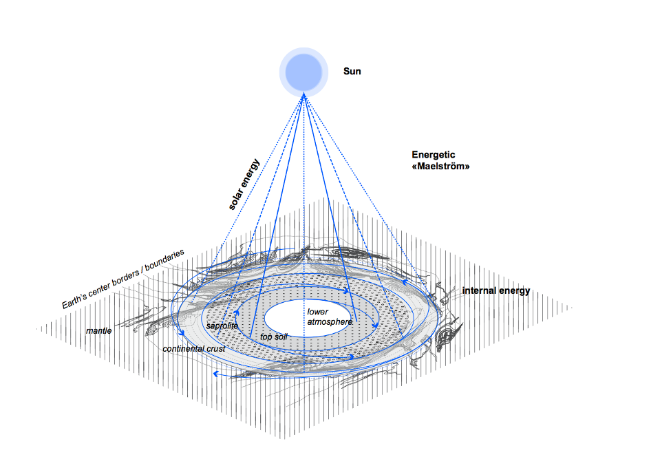(図1)Arènes, A., Latour, B., & Gaillardet, J. (2018). Giving Depth to the Surface: An Exercise in the Gaia-graphy of Critical Zones より抜粋. Anthropocene Review, 5(2), 120-135. https://doi.org/10.1177/2053019618782257