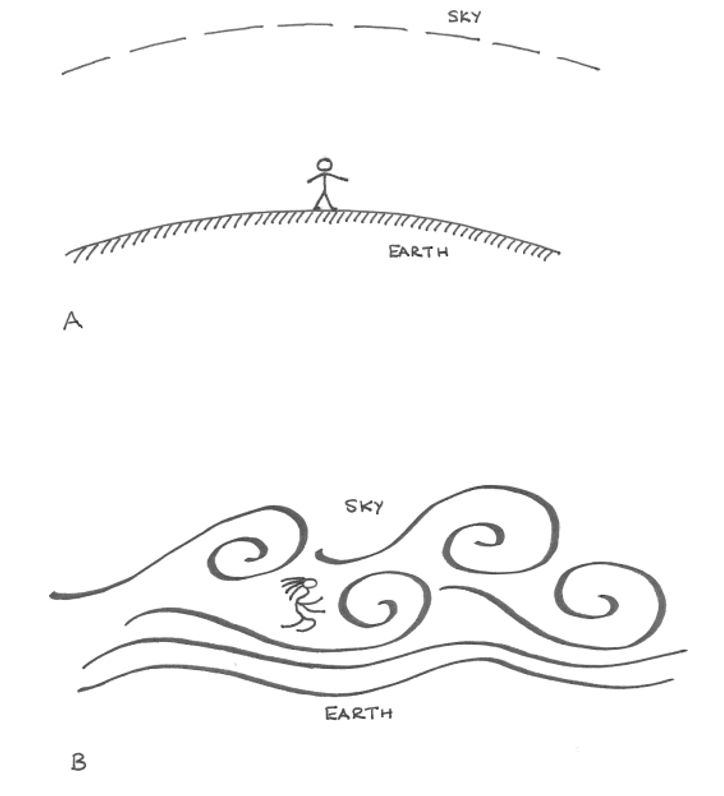 (図2)スライドより。「大地の余所者」(A)と「気象-世界の居住者」(B)の対比によって、インゴルドは「気象生成理論モデル」を構築しているという。生物社会的存在としての人の姿。